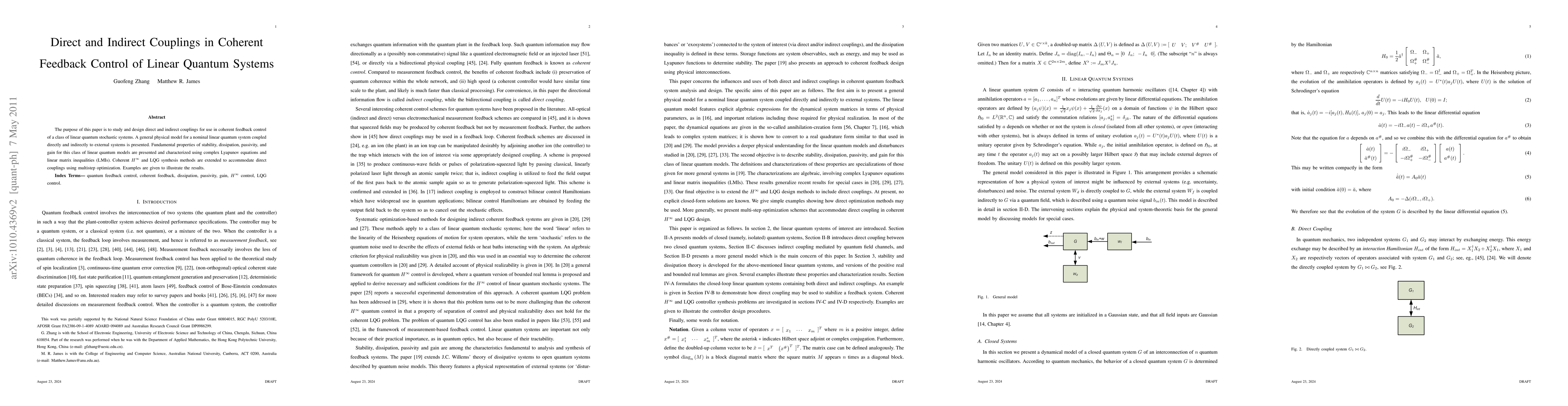 The purpose of this paper is to study and design direct and indirect couplings for use in coherent feedback control of a class of linear quantum stochastic systems. A general physical model for a nominal linear quantum system coupled directly and indirectly to external systems is presented. Fundamental properties of stability, dissipation, passivity, and gain for this class of linear quantum models are presented and characterized using complex Lyapunov equations and linear matrix inequalities (LMIs). Coherent $H^\infty$ and LQG synthesis methods are extended to accommodate direct couplings using multistep optimization. Examples are given to illustrate the results.