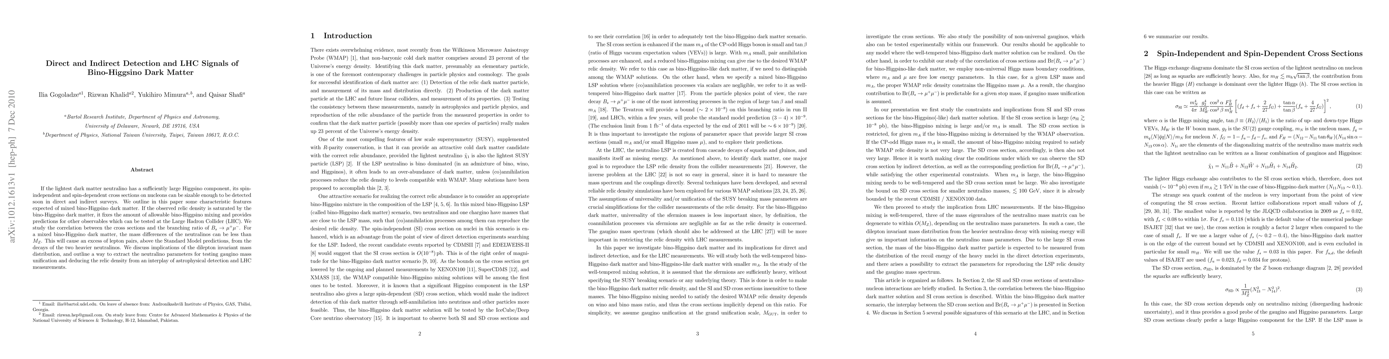 If the lightest dark matter neutralino has a sufficiently large Higgsino component, its spin-independent and spin-dependent cross sections on nucleons can be sizable enough to be detected soon in direct and indirect surveys. We outline in this paper some characteristic features expected of mixed bino-Higgsino dark matter. If the observed relic density is saturated by the bino-Higgsino dark matter, it fixes the amount of allowable bino-Higgsino mixing and provides predictions for other observables which can be tested at the Large Hadron Collider (LHC). We study the correlation between the cross sections and the branching ratio of B_s -> mu^+ mu^-. For a mixed bino-Higgsino dark matter, the mass differences of the neutralinos can be less than M_Z. This will cause an excess of lepton pairs, above the Standard Model predictions, from the decays of the two heavier neutralinos. We discuss implications of the dilepton invariant mass distribution, and outline a way to extract the neutralino parameters for testing gaugino mass unification and deducing the relic density from an interplay of astrophysical detection and LHC measurements.
