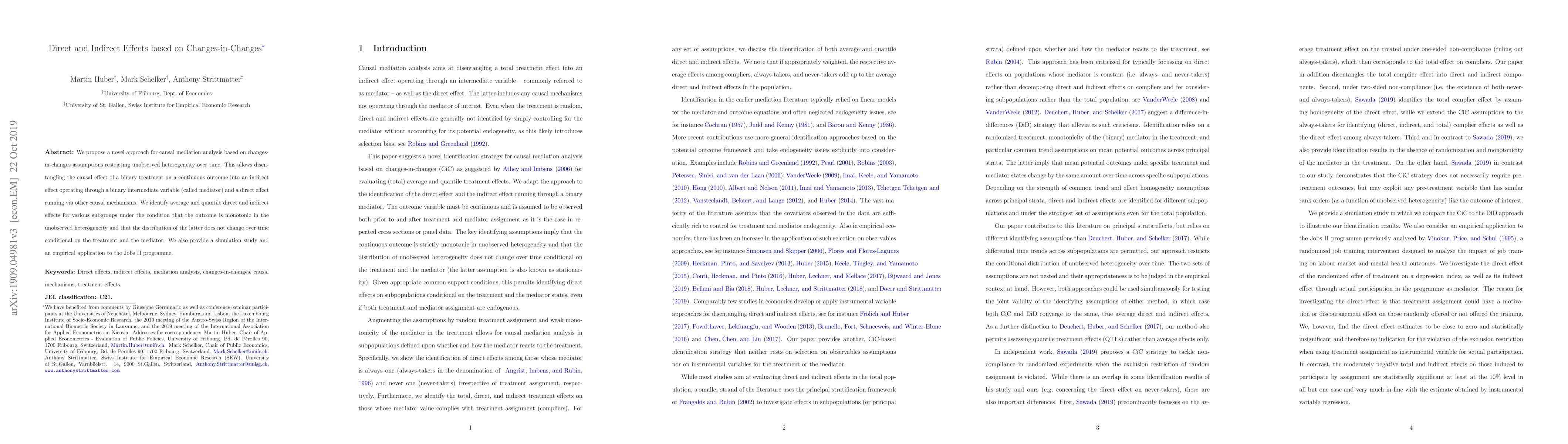 We propose a novel approach for causal mediation analysis based on changes-in-changes assumptions restricting unobserved heterogeneity over time. This allows disentangling the causal effect of a binary treatment on a continuous outcome into an indirect effect operating through a binary intermediate variable (called mediator) and a direct effect running via other causal mechanisms. We identify average and quantile direct and indirect effects for various subgroups under the condition that the outcome is monotonic in the unobserved heterogeneity and that the distribution of the latter does not change over time conditional on the treatment and the mediator. We also provide a simulation study and an empirical application to the Jobs II programme.