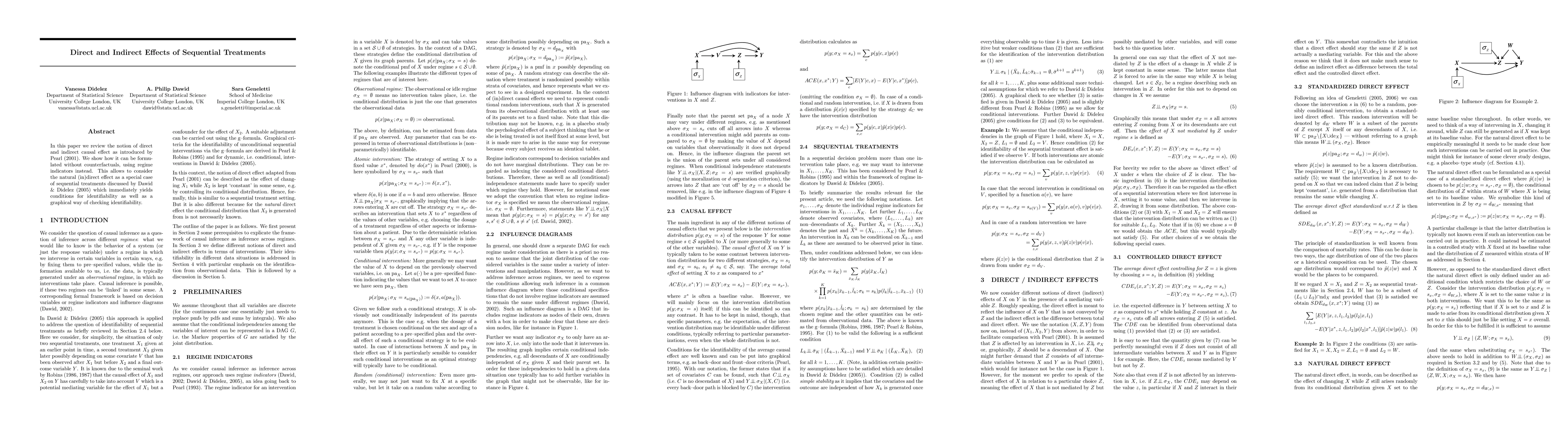 In this paper we review the notion of direct causal effect as introduced by Pearl (2001). We show how it can be formulated without counterfactuals, using intervention indicators instead. This allows to consider the natural direct effect as a special case of sequential treatments discussed by Dawid and Didelez (2005) which immediately yields conditions for identifiability as well as a graphical way of checking identifiability. The results are contrasted with the criteria given by Pearl (2001) and Robins (2003).