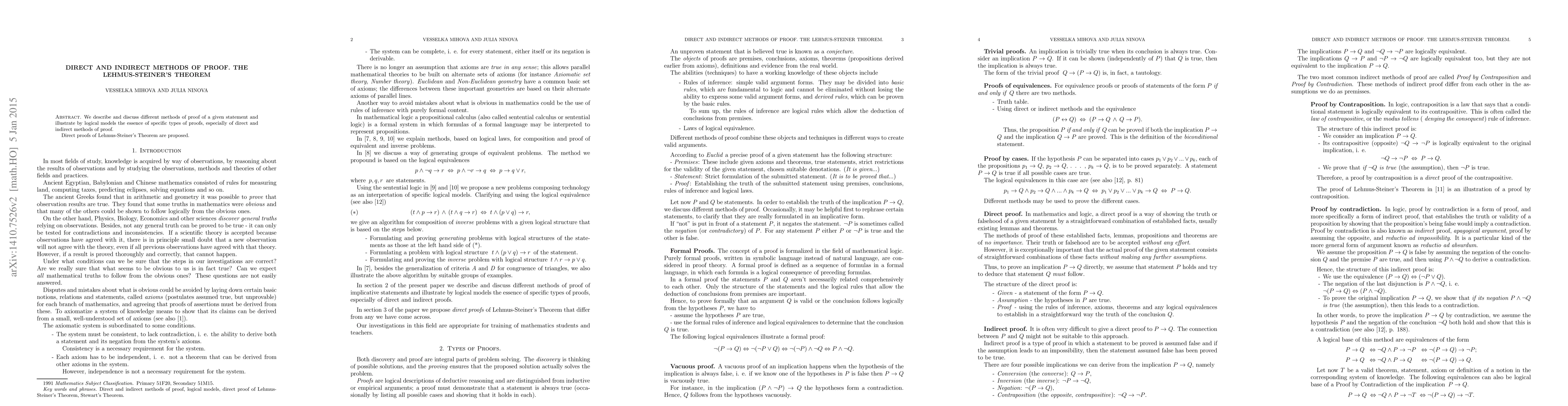 Summary: This paper explores various proof methods for a given statement, focusing on direct and indirect proofs with logical models. It proposes direct proofs for the Lehmus-Steiner theorem, illustrating the differences between these proof types.