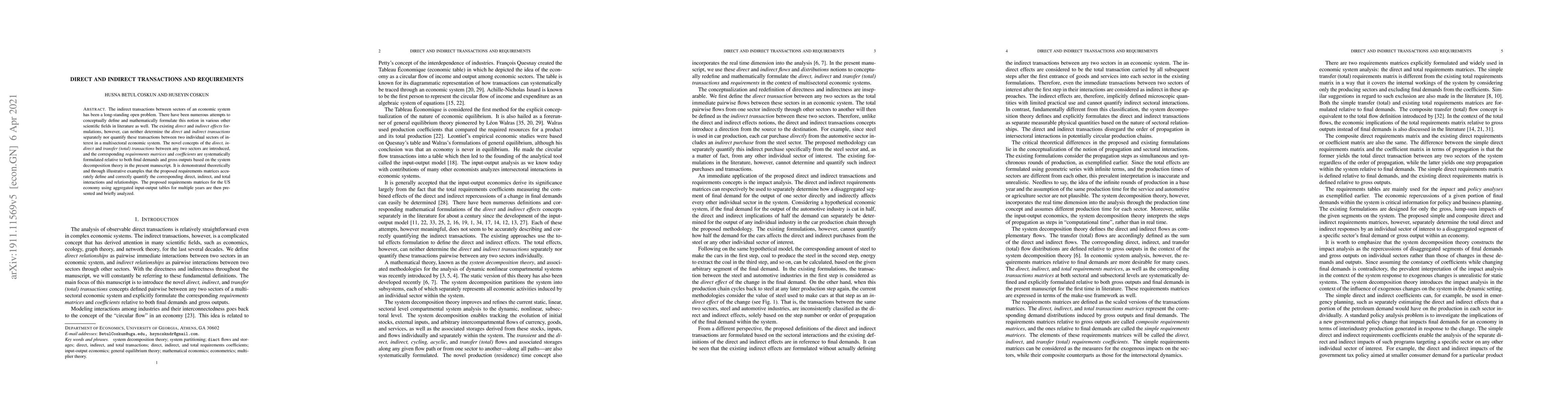 The indirect transactions between sectors of an economic system has been a long-standing open problem. There have been numerous attempts to conceptually define and mathematically formulate this notion in various other scientific fields in literature as well. The existing direct and indirect effects formulations, however, can neither determine the direct and indirect transactions separately nor quantify these transactions between two individual sectors of interest in a multisectoral economic system. The novel concepts of the direct, indirect and transfer (total) transactions between any two sectors are introduced, and the corresponding requirements matrices and coefficients are systematically formulated relative to both final demands and gross outputs based on the system decomposition theory in the present manuscript. It is demonstrated theoretically and through illustrative examples that the proposed requirements matrices accurately define and correctly quantify the corresponding direct, indirect, and total interactions and relationships. The proposed requirements matrices for the US economy using aggregated input-output tables for multiple years are then presented and briefly analyzed.