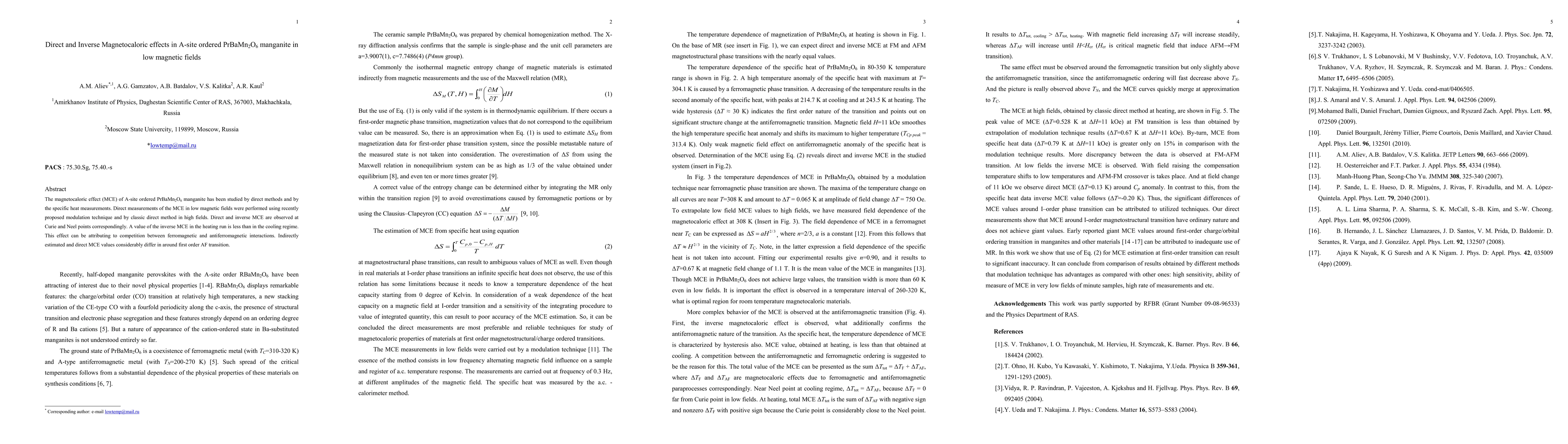 This study investigates the magnetocaloric effect (MCE) in A-site ordered PrBaMn2O6 manganite, revealing both direct and inverse MCE at the Curie and Neel points, respectively. The modulation technique and specific heat measurements show differing values of inverse MCE between heating and cooling, suggesting competition between ferromagnetic and antiferromagnetic interactions.