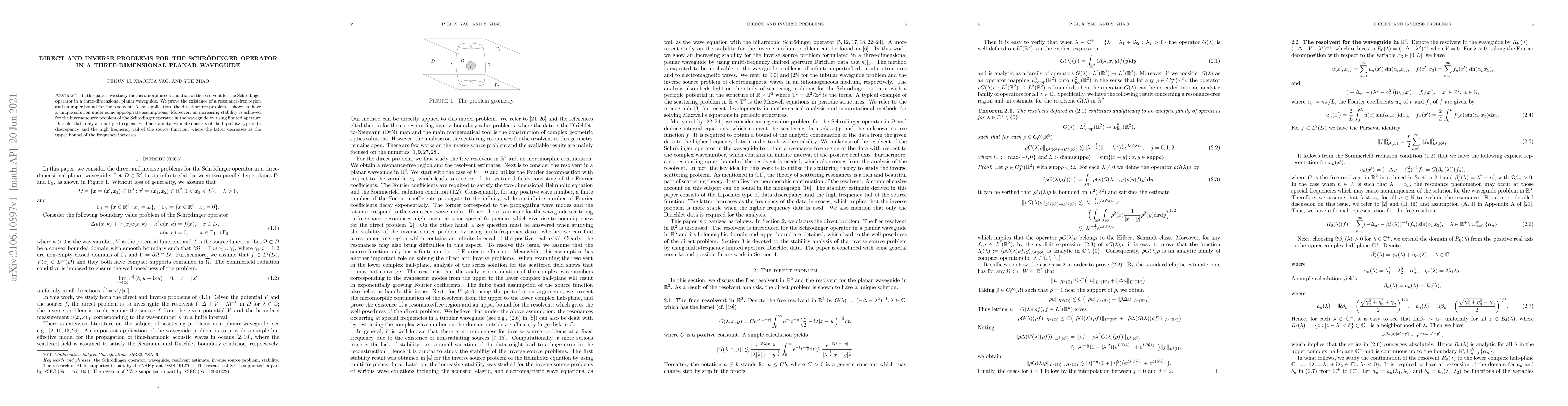 This paper investigates the meromorphic continuation of the resolvent for the Schrödinger operator in a three-dimensional planar waveguide, proving a resonance-free region and an upper bound for the resolvent. It demonstrates unique solvability for the direct source problem and increasing stability for the inverse source problem using limited Dirichlet data at multiple frequencies.