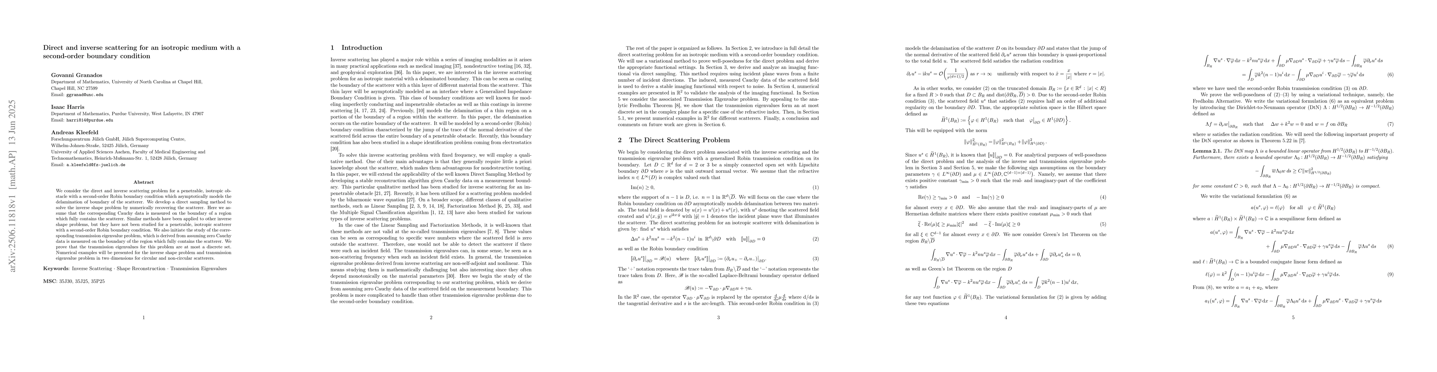 We consider the direct and inverse scattering problem for a penetrable, isotropic obstacle with a second-order Robin boundary condition which asymptotically models the delamination of boundary of the scatterer. We develop a direct sampling method to solve the inverse shape problem by numerically recovering the scatterer. Here we assume that the corresponding Cauchy data is measured on the boundary of a region which fully contains the scatterer. Similar methods have been applied to other inverse shape problems, but they have not been studied for a penetrable, isotropic scatterer with a second-order Robin boundary condition. We also initiate the study of the corresponding transmission eigenvalue problem, which is derived from assuming zero Cauchy data is measured on the boundary of the region which fully contains the scatterer. We prove that the transmission eigenvalues for this problem are at most a discrete set. Numerical examples will be presented for the inverse shape problem and transmission eigenvalue problem in two dimensions for circular and non-circular scatterers.