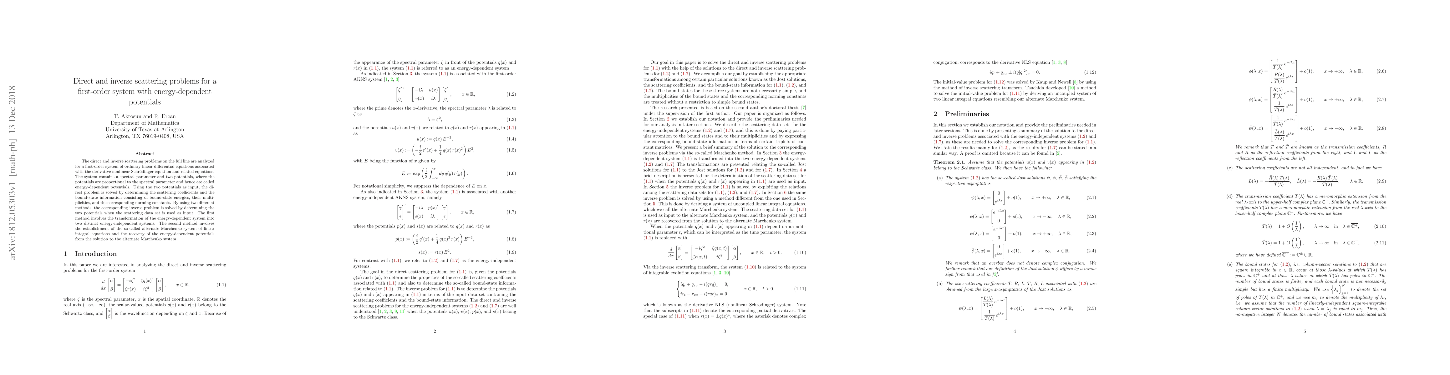 This paper analyzes direct and inverse scattering problems for a first-order system linked to the derivative nonlinear Schrödinger equation, featuring energy-dependent potentials. It determines scattering coefficients and bound-state information directly, and solves the inverse problem using two methods: transforming the system into energy-independent forms and solving the alternate Marchenko system.