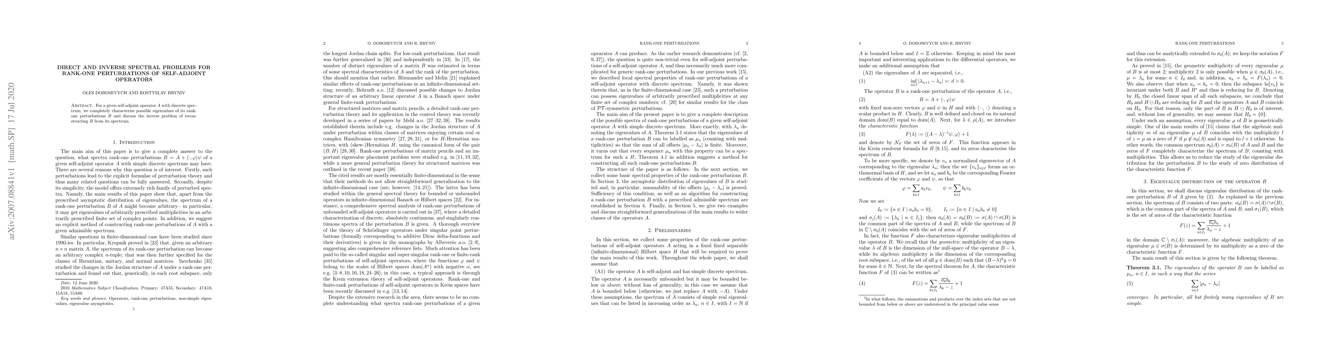 Summary: This paper characterizes eigenvalues of rank-one perturbations of a self-adjoint operator with discrete spectrum and addresses the inverse problem of reconstructing the perturbation from its spectral data.