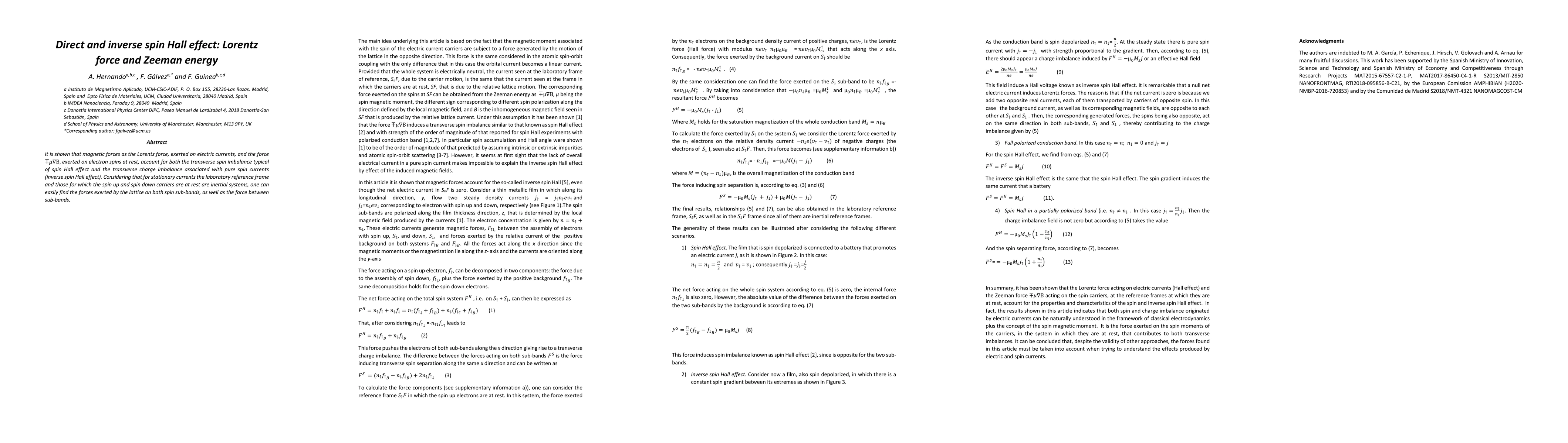 It is shown that magnetic forces as the Lorentz force, exerted on electric currents, and the force {\mu}Div(B), exerted on electron spins at rest, account for both the transverse spin imbalance typical of spin Hall effect and the transverse charge imbalance associated with pure spin currents (inverse spin Hall effect). Considering that for stationary currents the laboratory reference frame and those for which the spin up and spin down carriers are at rest are inertial systems, one can easily find the forces exerted by the lattice on both spin sub-bands, as well as the force between sub-bands.