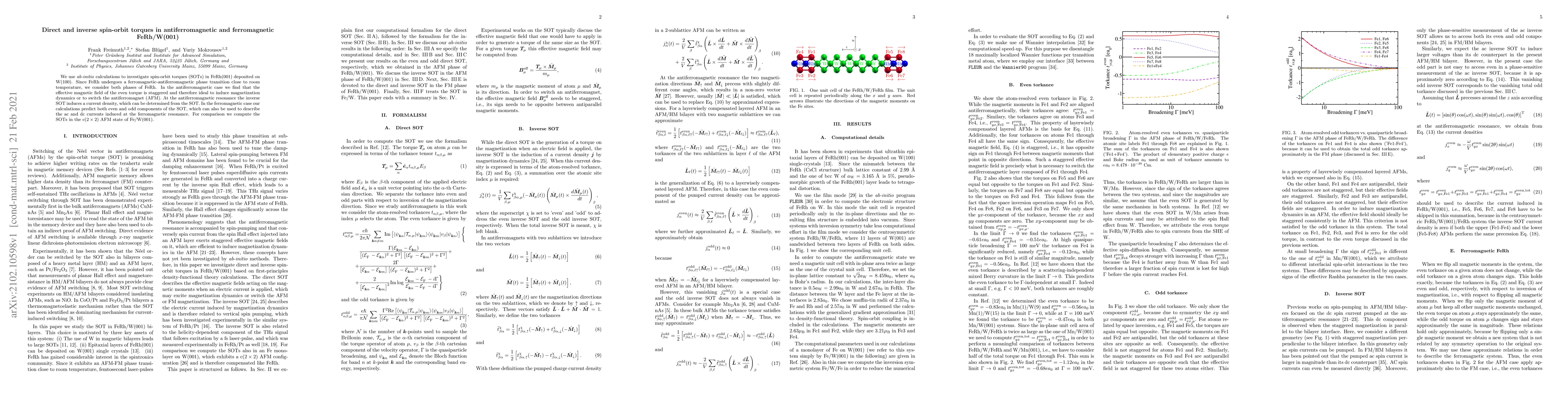 We use \textit{ab-initio} calculations to investigate spin-orbit torques (SOTs) in FeRh(001) deposited on W(100). Since FeRh undergoes a ferromagnetic-antiferromagnetic phase transition close to room temperature, we consider both phases of FeRh. In the antiferromagnetic case we find that the effective magnetic field of the even torque is staggered and therefore ideal to induce magnetization dynamics or to switch the antiferromagnet (AFM). At the antiferromagnetic resonance the inverse SOT induces a current density, which can be determined from the SOT. In the ferromagnetic case our calculations predict both even and odd components of the SOT, which can also be used to describe the ac and dc currents induced at the ferromagnetic resonance. For comparison we compute the SOTs in the c($2\times 2$) AFM state of Fe/W(001).