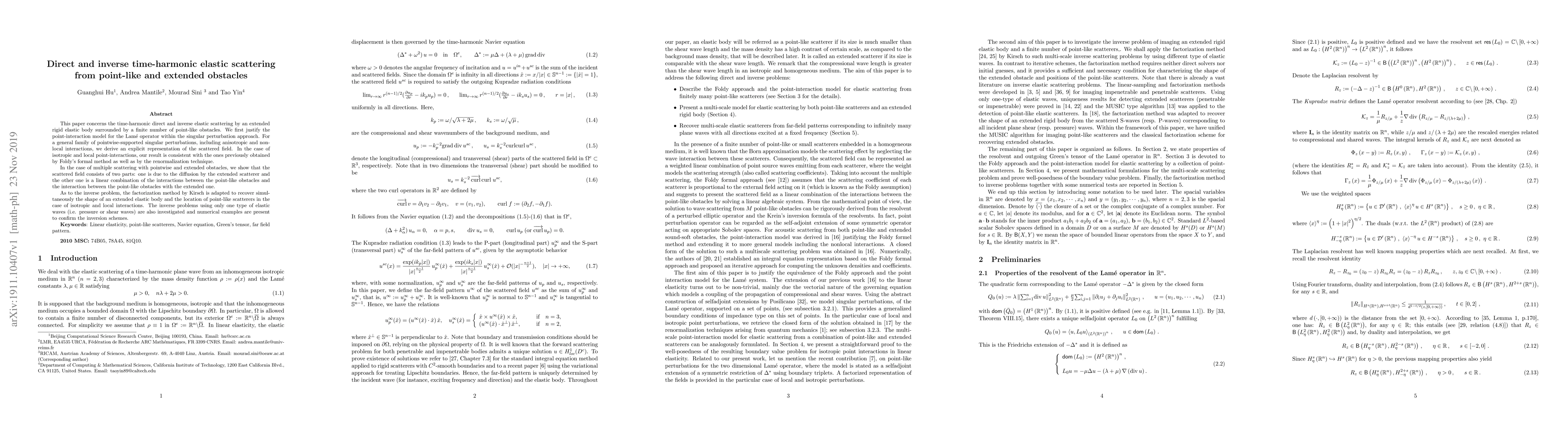 This paper concerns the time-harmonic direct and inverse elastic scattering by an extended rigid elastic body surrounded by a finite number of point-like obstacles. We first justify the point-interaction model for the Lam\'{e} operator within the singular perturbation approach. For a general family of pointwise-supported singular perturbations, including anisotropic and non-local interactions, we derive an explicit representation of the scattered field. In the case of isotropic and local point-interactions, our result is consistent with the ones previously obtained by Foldy's formal method as well as by the renormalization technique. In the case of multiple scattering with pointwise and extended obstacles, we show that the scattered field consists of two parts: one is due to the diffusion by the extended scatterer and the other one is a linear combination of the interactions between the point-like obstacles and the interaction between the point-like obstacles with the extended one. As to the inverse problem, the factorization method by Kirsch is adapted to recover simultaneously the shape of an extended elastic body and the location of point-like scatterers in the case of isotropic and local interactions. The inverse problems using only one type of elastic waves (i.e. pressure or shear waves) are also investigated and numerical examples are present to confirm the inversion schemes.