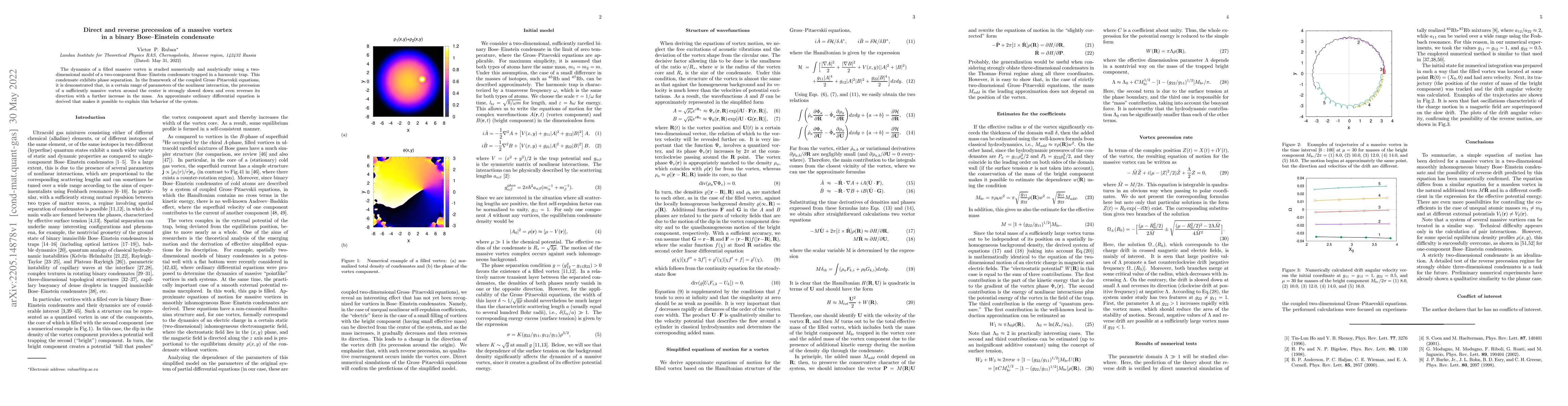 This paper investigates the dynamics of a massive vortex in a binary Bose-Einstein condensate, showing that its precession can slow down and reverse under specific nonlinear interaction conditions, explained through an approximate ordinary differential equation.