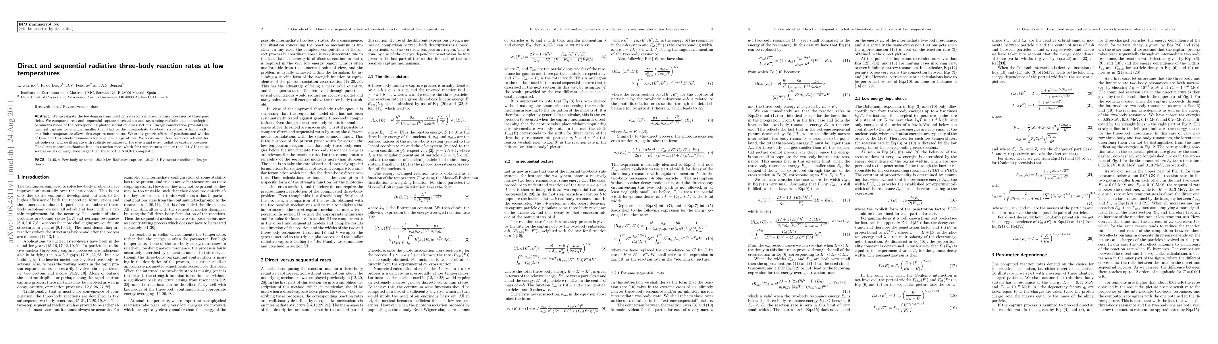 This paper investigates low-temperature reaction rates for radiative three-body capture processes, comparing direct and sequential mechanisms. It finds that direct capture rates can be significantly larger than previously compiled values for temperatures below 0.1 GK, especially for nuclear reactions relevant in astrophysics like $\alpha$-$\alpha$-$\alpha$ and $\alpha$-$\alpha$-$n$.