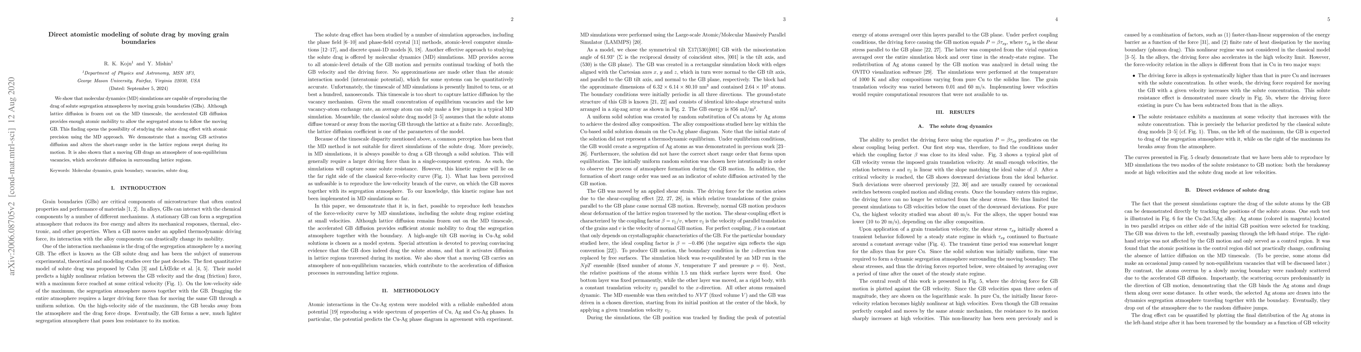 Molecular dynamics simulations reveal that moving grain boundaries can drag solute segregation atmospheres, facilitated by accelerated boundary diffusion. This atomic-level insight allows precise study of solute drag effects and shows that moving grain boundaries also induce non-equilibrium vacancy atmospheres, enhancing diffusion in surrounding lattice regions.