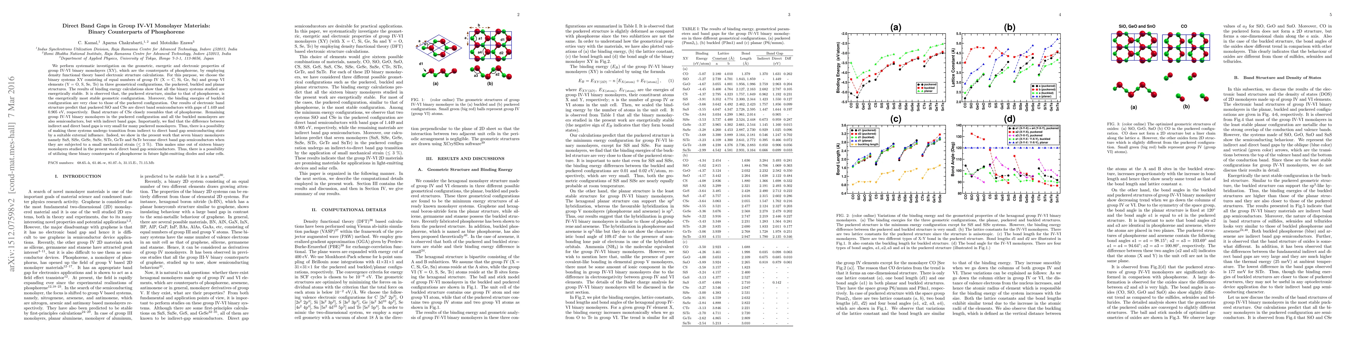 We perform systematic investigation on the geometric, energetic and electronic properties of group IV-VI binary monolayers (XY), which are the counterparts of phosphorene, by employing density functional theory based electronic structure calculations. For this purpose, we choose the binary systems XY consisting of equal numbers of group IV (X = C, Si, Ge, Sn) and group VI elements (Y = O, S, Se, Te) in three geometrical configurations, the puckered, buckled and planar structures. The results of binding energy calculations show that all the binary systems studied are energetically stable. It is observed that, the puckered structure, similar to that of phosphorene, is the energetically most stable geometric configuration. Our results of electronic band structure predict that puckered SiO and CSe are direct band semiconductors with gaps of 1.449 and 0.905 eV, respectively. Band structure of CSe closely resembles that of phosphorene. Remaining group IV-VI binary monolayers in the puckered configuration and all the buckled monolayers are also semiconductors, but with indirect band gaps. Importantly, we find that the difference between indirect and direct band gaps is very small for many puckered monolayers. Thus, there is a possibility of making these systems undergo transition from indirect to direct band gap semiconducting state by a suitable external influence. Indeed, we show in the present work that seven binary monolayers namely SnS, SiSe, GeSe, SnSe, SiTe, GeTe and SnTe become direct band gap semiconductors when they are subjected to a small mechanical strain (<= 3 %). This makes nine out of sixteen binary monolayers studied in the present work direct band gap semiconductors. Thus, there is a possibility of utilizing these binary counterparts of phosphorene in future light-emitting diodes and solar cells.