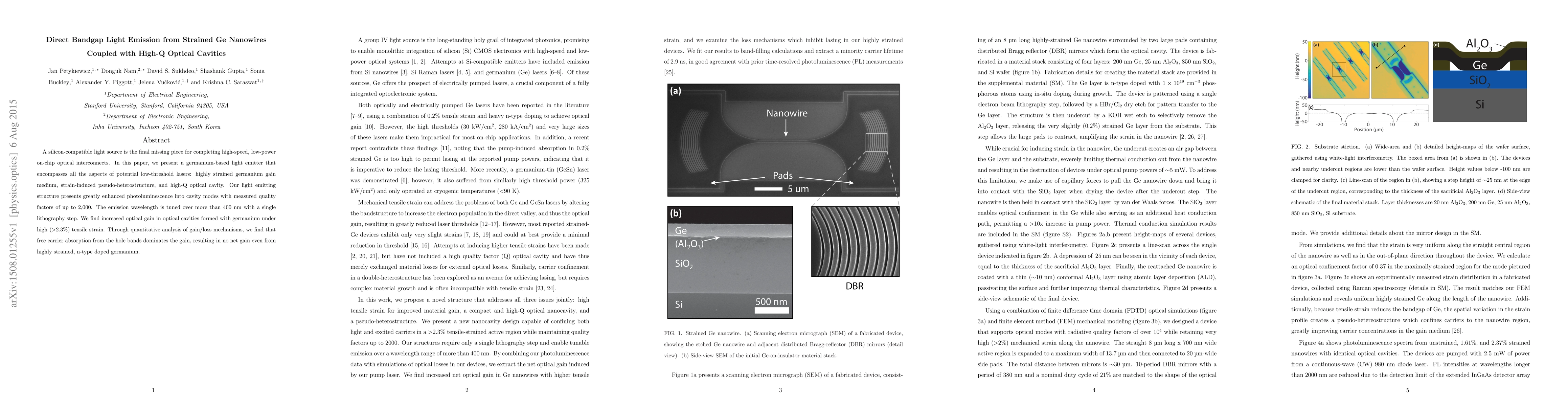 This paper introduces a germanium-based light emitter for silicon-compatible on-chip optical interconnects, featuring strained Ge nanowires coupled with high-Q optical cavities for enhanced photoluminescence. Despite high tensile strain and n-type doping, free carrier absorption limits net optical gain, preventing low-threshold laser operation.
