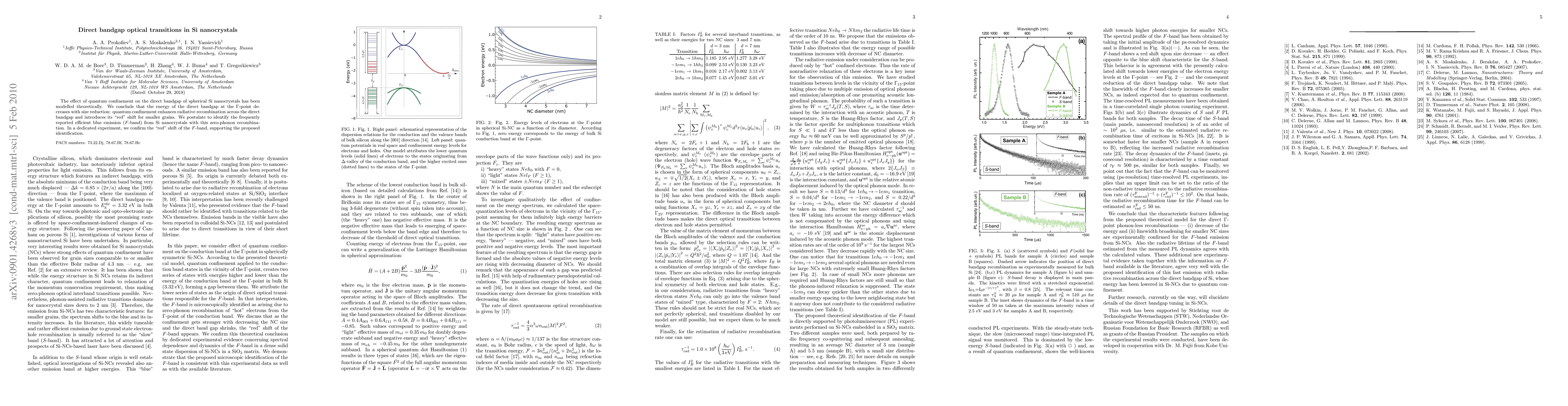 This paper theoretically models the quantum confinement effects on the direct bandgap of Si nanocrystals, finding that the bandgap energy decreases with size reduction, enhancing radiative recombination and causing a "red" shift. Experimental confirmation supports the identification of the F-band's blue emission with this zero-phonon recombination.