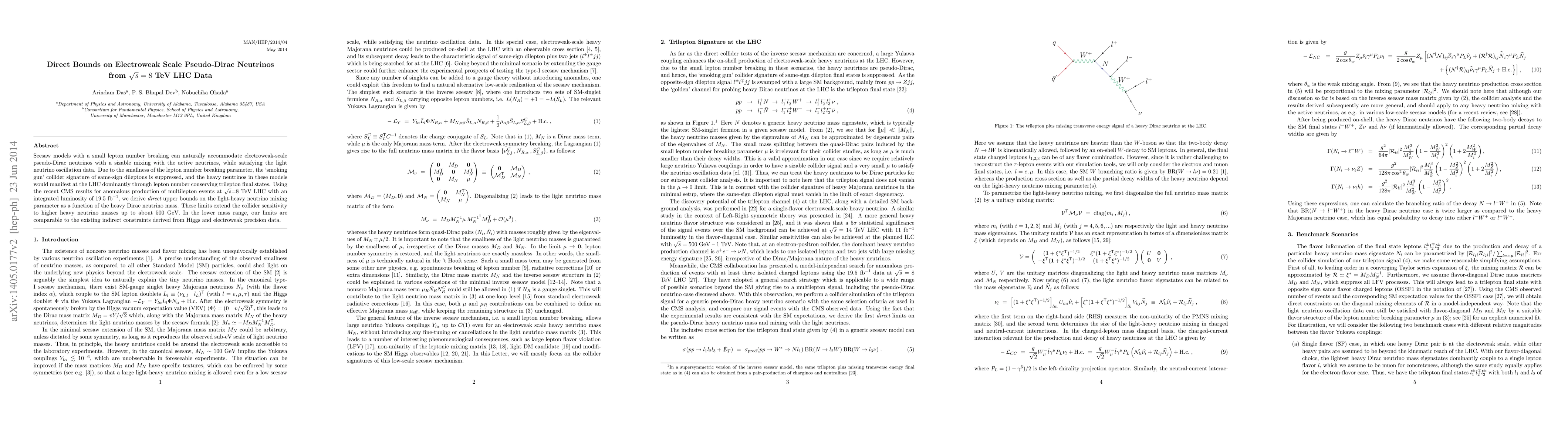 This paper derives direct upper bounds on the mixing parameter for electroweak-scale pseudo-Dirac neutrinos using 8 TeV LHC data, extending collider sensitivity to heavy neutrino masses up to 500 GeV, and compares these limits to indirect constraints from Higgs and electroweak precision data.