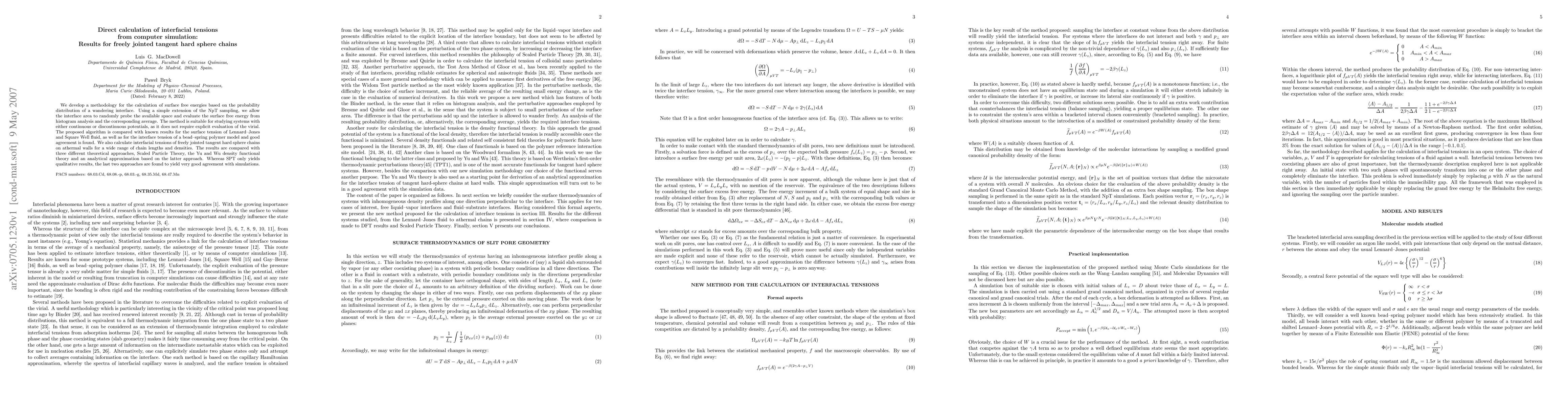We develop a methodology for the calculation of surface free energies based on the probability distribution of a wandering interface. Using a simple extension of the NpT sampling, we allow the interface area to randomly probe the available space and evaluate the surface free energy from histogram analysis and the corresponding average. The method is suitable for studying systems with either continuous or discontinuous potentials, as it does not require explicit evaluation of the virial. The proposed algorithm is compared with known results for the surface tension of Lennard--Jones and Square Well fluid, as well as for the interface tension of a bead--spring polymer model and good agreement is found. We also calculate interfacial tensions of freely jointed tangent hard sphere chains on athermal walls for a wide range of chain lengths and densities. The results are compared with three different theoretical approaches, Scaled Particle Theory, the Yu and Wu density functional theory and an analytical approximation based on the latter approach. Whereas SPT only yields qualitative results, the last two approaches are found to yield very good agreement with simulations.