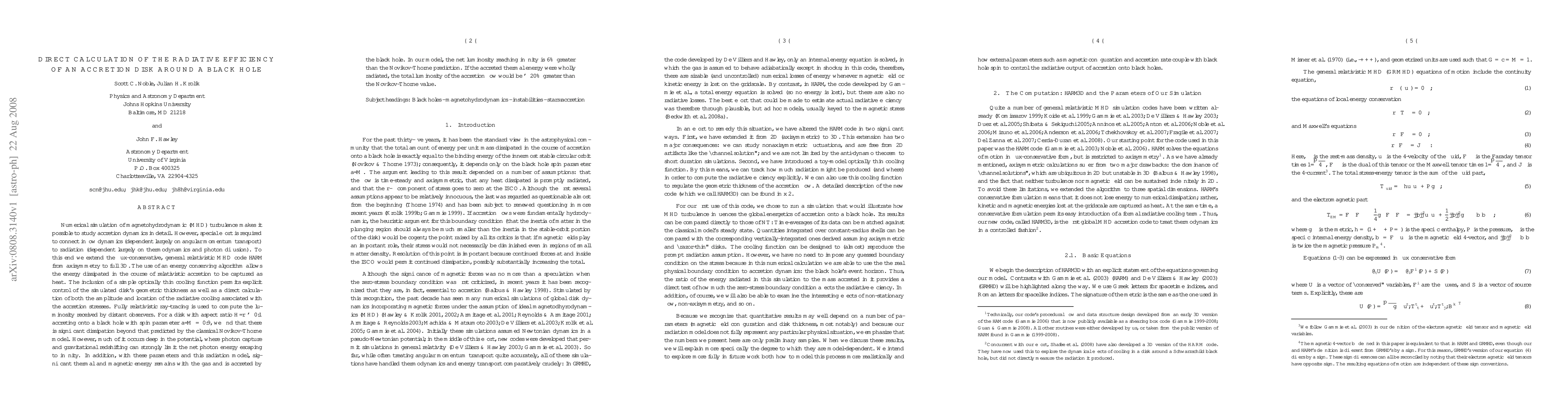 Numerical simulation of magnetohydrodynamic (MHD) turbulence makes it possible to study accretion dynamics in detail. However, special effort is required to connect inflow dynamics (dependent largely on angular momentum transport) to radiation (dependent largely on thermodynamics and photon diffusion). To this end we extend the flux-conservative, general relativistic MHD code HARM from axisymmetry to full 3D. The use of an energy conserving algorithm allows the energy dissipated in the course of relativistic accretion to be captured as heat. The inclusion of a simple optically thin cooling function permits explicit control of the simulated disk's geometric thickness as well as a direct calculation of both the amplitude and location of the radiative cooling associated with the accretion stresses. Fully relativistic ray-tracing is used to compute the luminosity received by distant observers. For a disk with aspect ratio H/r ~ 0.1 accreting onto a black hole with spin parameter a/M = 0.9, we find that there is significant dissipation beyond that predicted by the classical Novikov-Thorne model. However, much of it occurs deep in the potential, where photon capture and gravitational redshifting can strongly limit the net photon energy escaping to infinity. In addition, with these parameters and this radiation model, significant thermal and magnetic energy remains with the gas and is accreted by the black hole. In our model, the net luminosi ty reaching infinity is 6% greater than the Novikov-Thorne prediction. If the accreted thermal energy were wholly radiated, the total luminosity of the accretion flow would be ~20% greater than the Novikov-Thorne value.