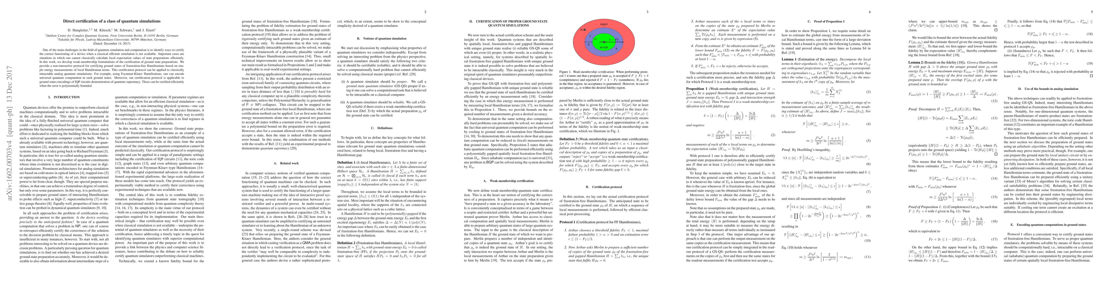 One of the main challenges in the field of quantum simulation and computation is to identify ways to certify the correct functioning of a device when a classical efficient simulation is not available. Important cases are situations in which one cannot classically calculate local expectation values of state preparations efficiently. In this work, we develop weak-membership formulations of the certification of ground state preparations. We provide a non-interactive protocol for certifying ground states of frustration-free Hamiltonians based on simple energy measurements of local Hamiltonian terms. This certification protocol can be applied to classically intractable analog quantum simulations: For example, using Feynman-Kitaev Hamiltonians, one can encode universal quantum computation in such ground states. Moreover, our certification protocol is applicable to ground states encodings of IQP circuits demonstration of quantum supremacy. These can be certified efficiently when the error is polynomially bounded.