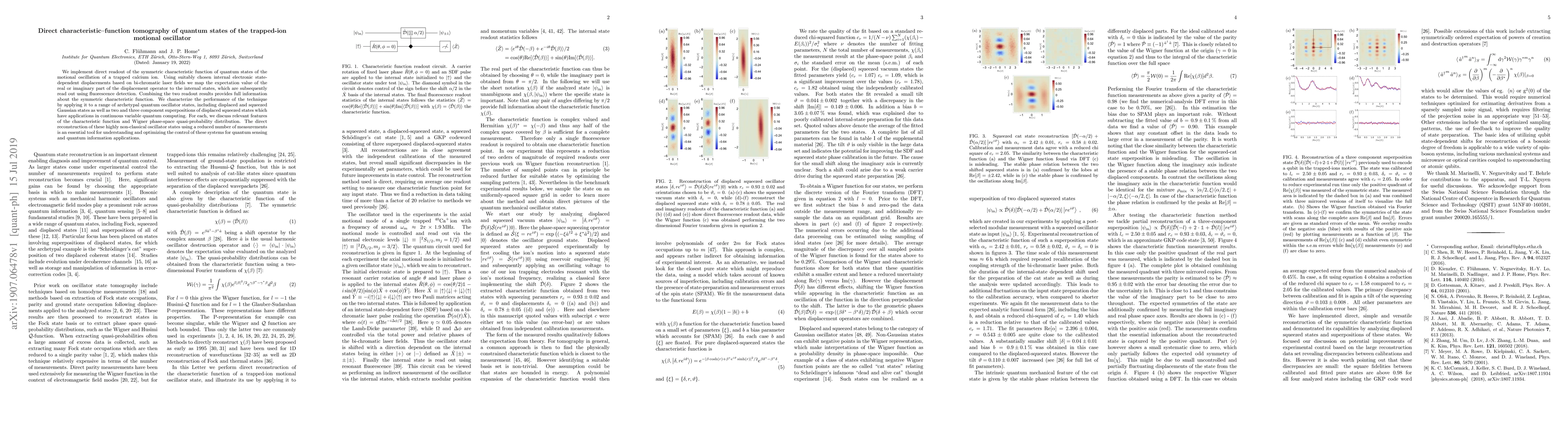 This paper presents a method for directly measuring the symmetric characteristic function of quantum states in a trapped calcium ion's motional oscillator using bi-chromatic laser fields and fluorescence detection. The technique enables the reconstruction of non-classical states, crucial for quantum computing and sensing applications.