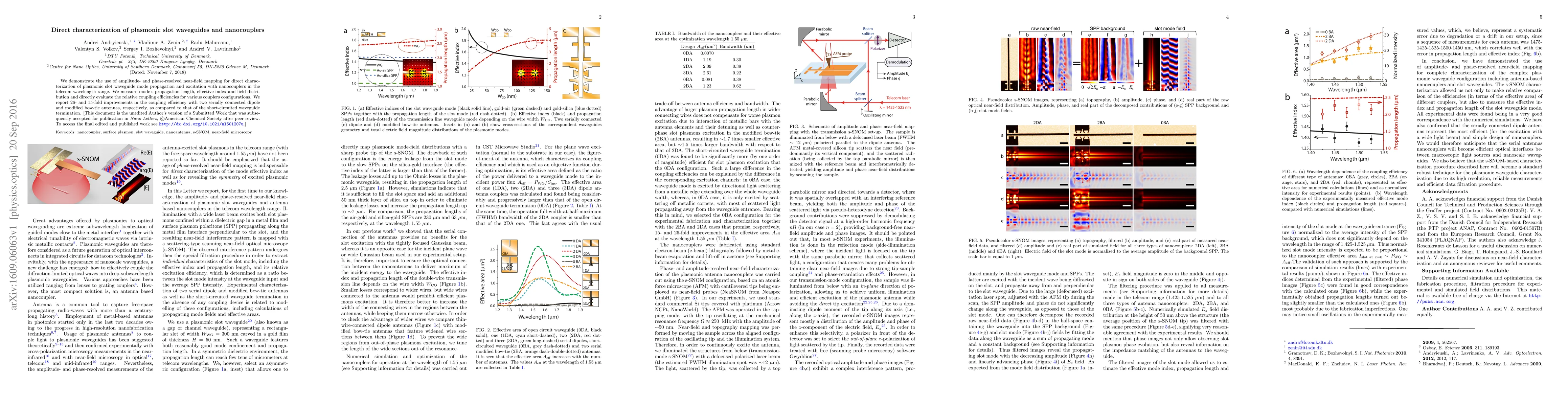 This paper presents a method for directly characterizing plasmonic slot waveguides and nanocouplers using amplitude- and phase-resolved near-field mapping, achieving significant improvements in coupling efficiency for various configurations, including 26-fold and 15-fold enhancements with dipole and modified bow-tie antennas.