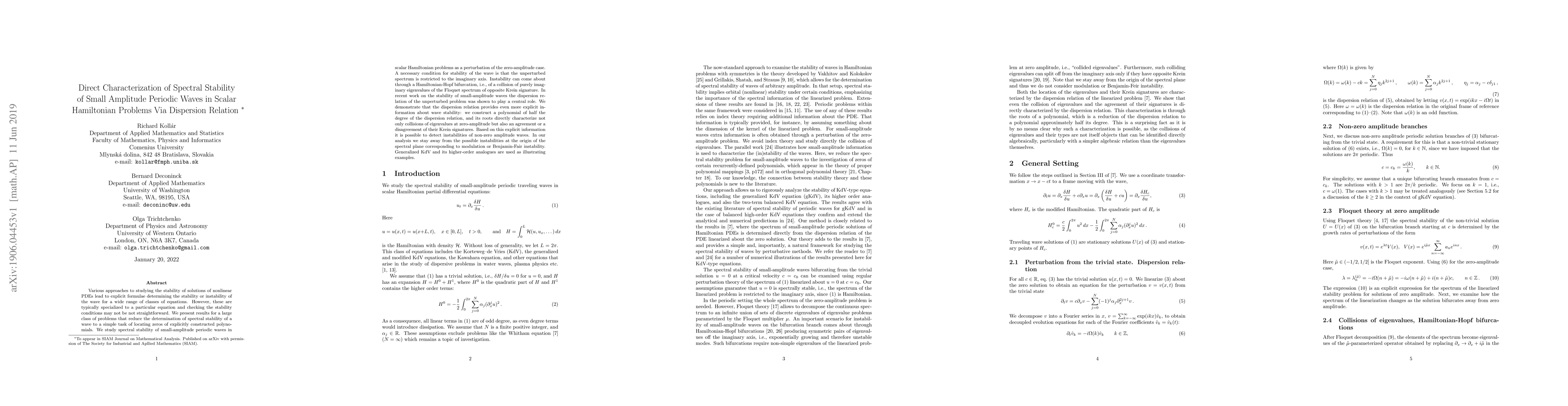 This paper presents a method to determine the spectral stability of small-amplitude periodic waves in scalar Hamiltonian problems by reducing the task to finding zeros of explicitly constructed polynomials. The dispersion relation is shown to provide detailed information about wave stability, allowing for the detection of instabilities through eigenvalue collisions and Krein signature agreements or disagreements.