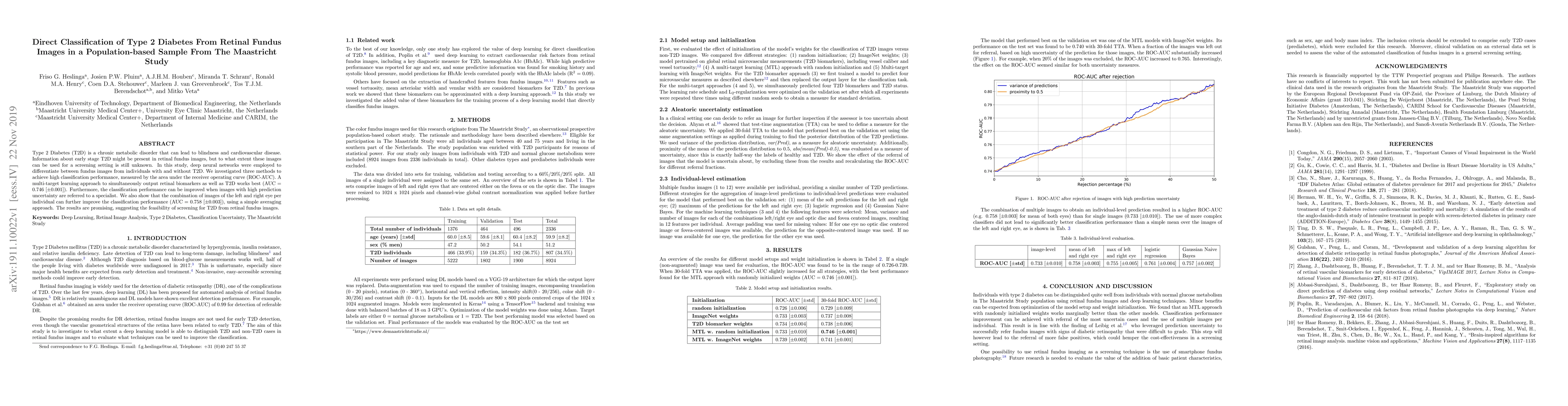 Type 2 Diabetes (T2D) is a chronic metabolic disorder that can lead to blindness and cardiovascular disease. Information about early stage T2D might be present in retinal fundus images, but to what extent these images can be used for a screening setting is still unknown. In this study, deep neural networks were employed to differentiate between fundus images from individuals with and without T2D. We investigated three methods to achieve high classification performance, measured by the area under the receiver operating curve (ROC-AUC). A multi-target learning approach to simultaneously output retinal biomarkers as well as T2D works best (AUC = 0.746 [$\pm$0.001]). Furthermore, the classification performance can be improved when images with high prediction uncertainty are referred to a specialist. We also show that the combination of images of the left and right eye per individual can further improve the classification performance (AUC = 0.758 [$\pm$0.003]), using a simple averaging approach. The results are promising, suggesting the feasibility of screening for T2D from retinal fundus images.
