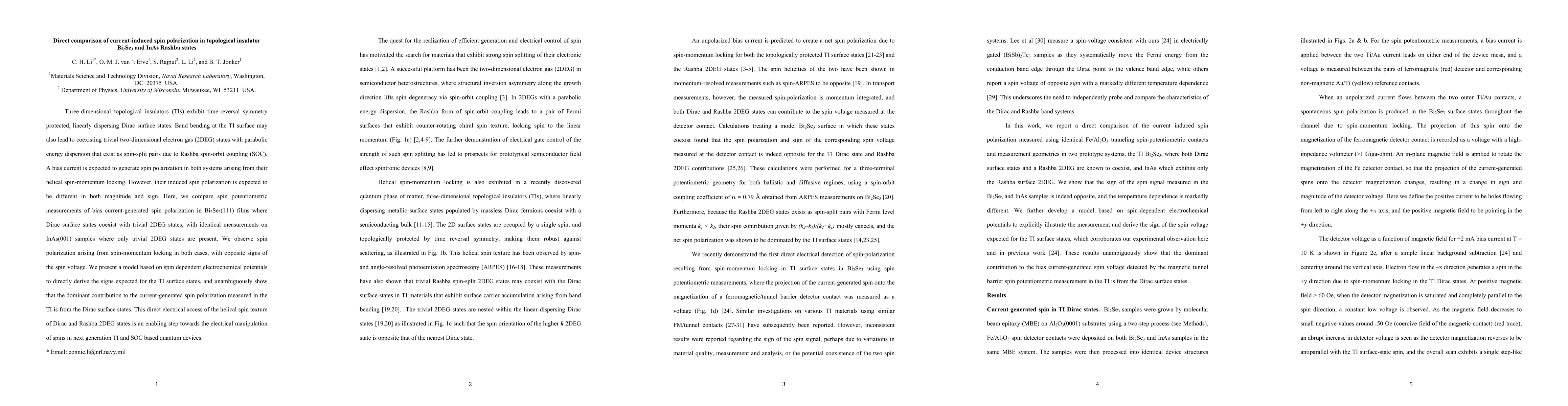 This paper compares spin polarization induced by bias current in topological insulator Bi2Se3 and InAs, revealing opposite spin voltage signs due to different spin-momentum locking mechanisms. The study demonstrates that the dominant spin polarization in Bi2Se3 arises from its Dirac surface states, highlighting the potential for electrical manipulation of spins in quantum devices.