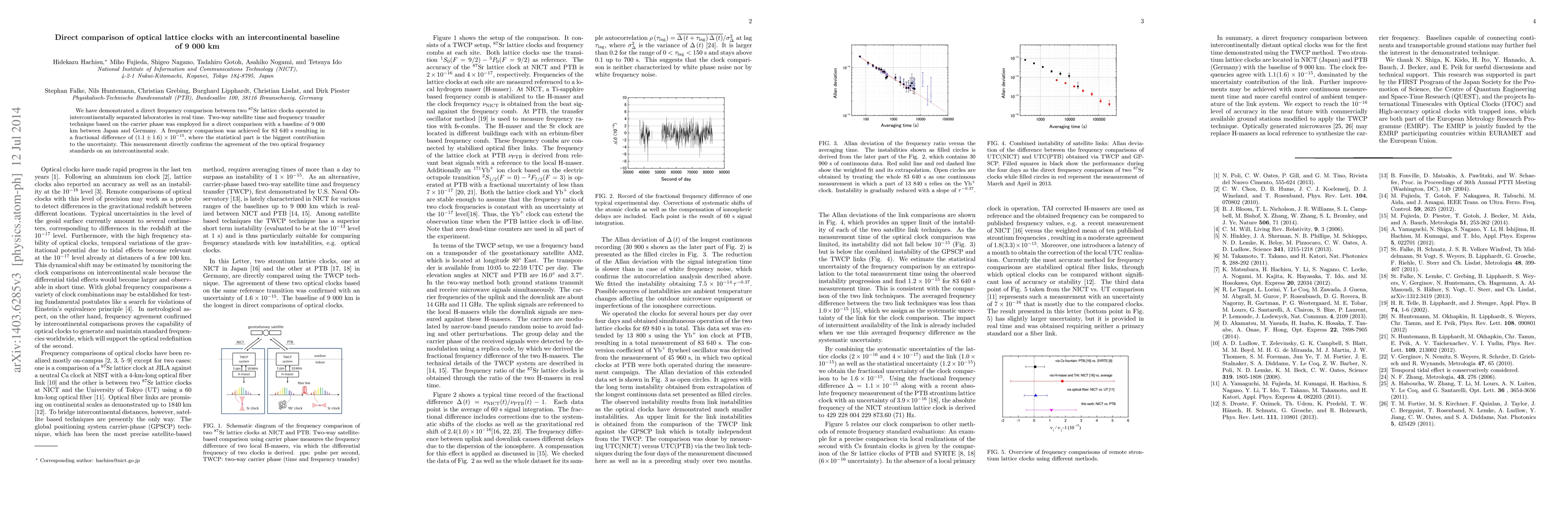 Researchers compared two $^{87}{ m Sr}$ optical lattice clocks separated by 9,000 km using a satellite-based technique, achieving a fractional frequency difference of $(1.1 m pm)$. The measurement confirms the agreement of the two clocks on an intercontinental scale.