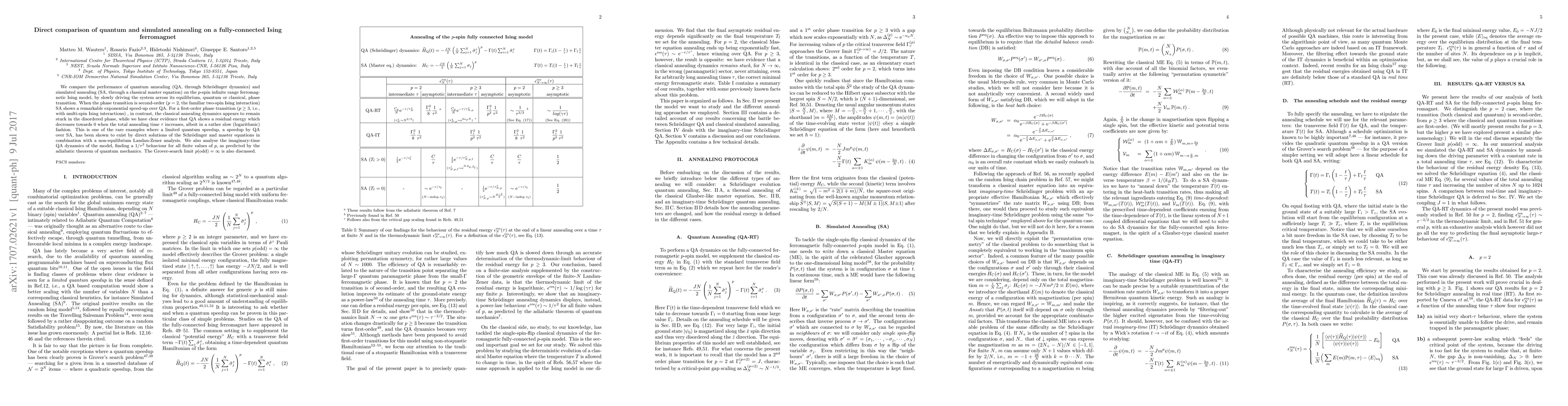 This paper compares quantum annealing (QA) and simulated annealing (SA) on a fully-connected Ising ferromagnet, finding that SA shows an exponential speed-up over QA for second-order phase transitions, while QA demonstrates a limited quantum speedup for first-order transitions. The study also confirms the adiabatic theorem's predictions for QA dynamics.