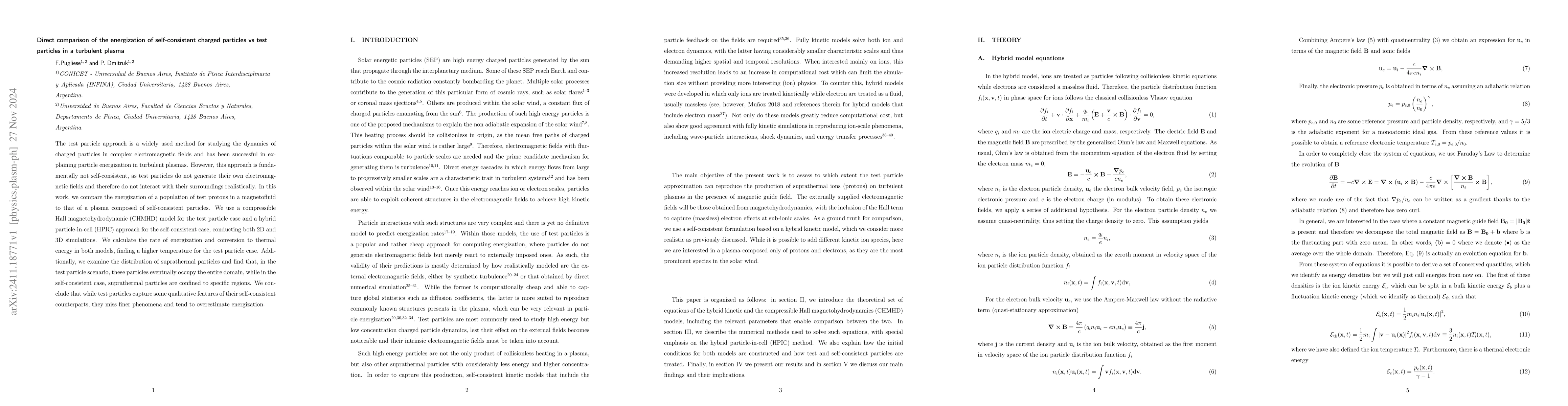 This study compares particle energization in turbulent plasmas using test particles versus self-consistent charged particles, finding that test particles overestimate energization and miss finer phenomena, while self-consistent particles show a more realistic distribution of suprathermal particles.