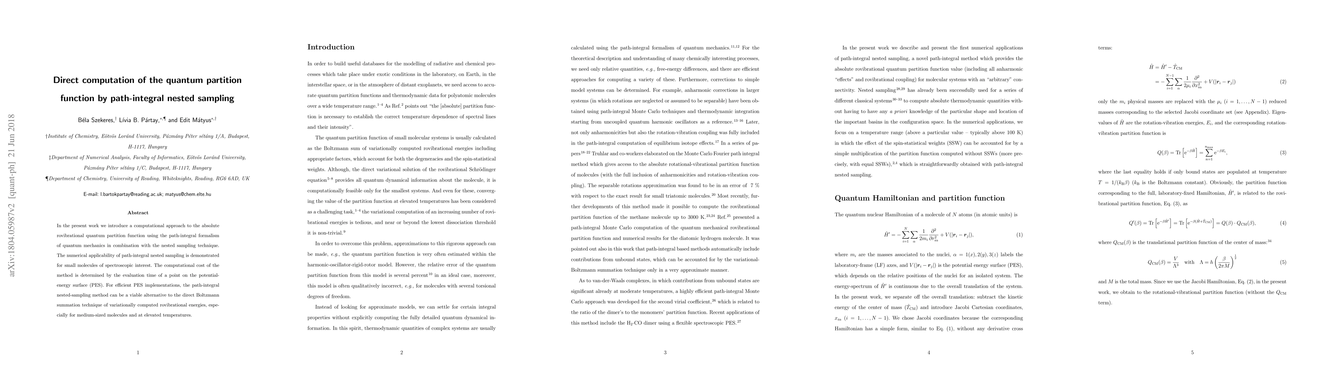 This paper presents a computational method combining path-integral formalism with nested sampling to calculate the quantum partition function for rovibrational states. The method is shown to be effective for small molecules and offers a cost-efficient alternative to direct Boltzmann summation, particularly for medium-sized molecules at higher temperatures.