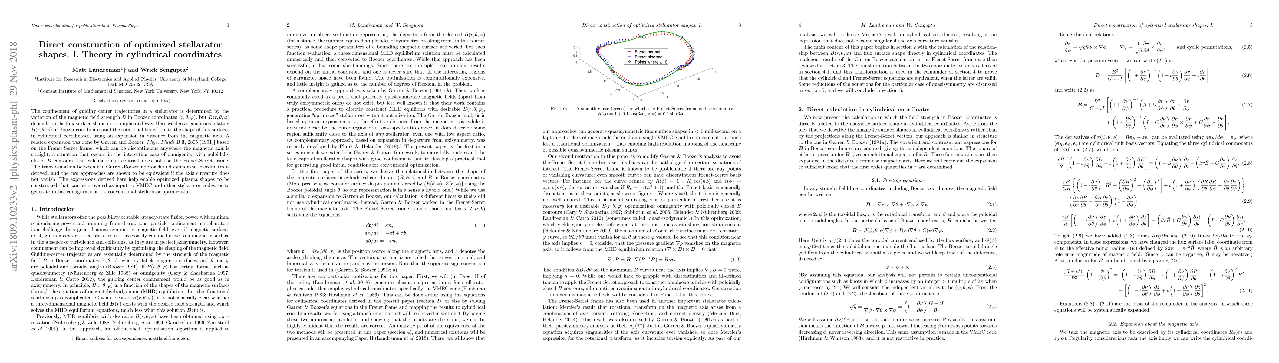 This paper develops equations linking magnetic field strength and rotational transform in Boozer coordinates to flux surface shapes in cylindrical coordinates, offering a method to construct optimized stellarator plasma shapes without relying on the Frenet-Serret frame, and demonstrating equivalence to the Garren-Boozer approach when axis curvature is non-zero.
