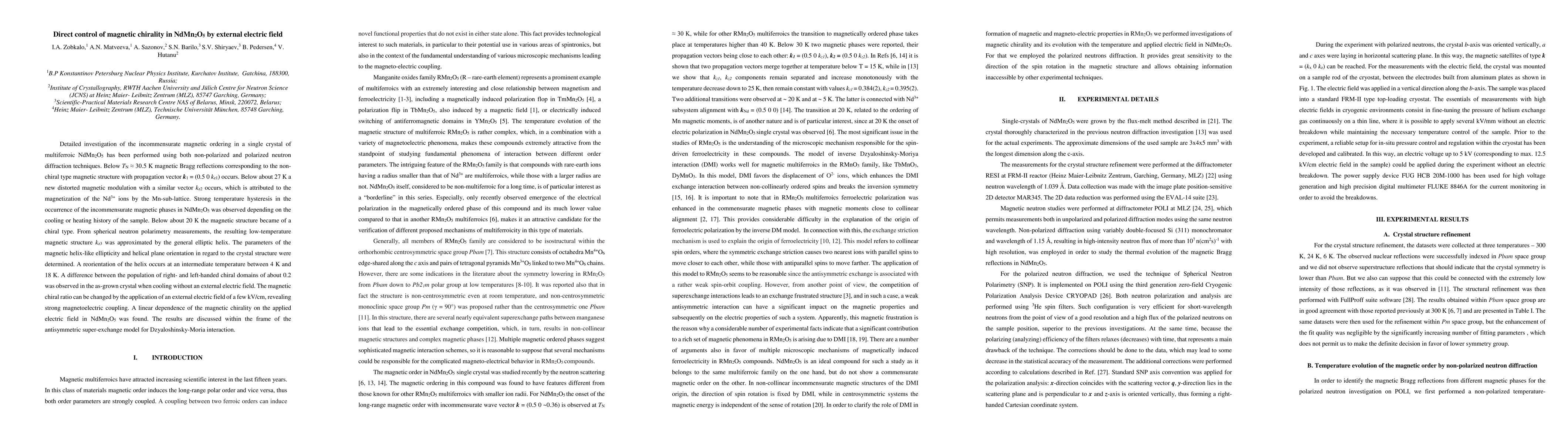 Detailed investigation of the incommensurate magnetic ordering in a single crystal of multiferroic NdMn2O5 has been performed using both non-polarized and polarized neutron diffraction techniques. Below TN = 30.5 K magnetic Bragg reflections corresponding to the non-chiral type magnetic structure with propagation vector k1 = (0.5 0 kz1) occurs. Below about 27 K a new distorted magnetic modulation with a similar vector kz2 occurs, which is attributed to the magnetization of the Nd3+ ions by the Mn-sub-lattice. Strong temperature hysteresis in the occurrence of the incommensurate magnetic phases in NdMn2O5 was observed depending on the cooling or heating history of the sample. Below about 20 K the magnetic structure became of a chiral type. From spherical neutron polarimetry measurements, the resulting low-temperature magnetic structure kz3 was approximated by the general elliptic helix. The parameters of the magnetic helix-like ellipticity and helical plane orientation in regard to the crystal structure were determined. A reorientation of the helix occurs at an intermediate temperature between 4 K and 18 K. A difference between the population of right- and left-handed chiral domains of about 0.2 was observed in the as-grown crystal when cooling without an external electric field. The magnetic chiral ratio can be changed by the application of an external electric field of a few kV/cm, revealing strong magnetoelectric coupling. A linear dependence of the magnetic chirality on the applied electric field in NdMn2O5 was found. The results are discussed within the frame of the antisymmetric super-exchange model for Dzyaloshinsky-Moria interaction.