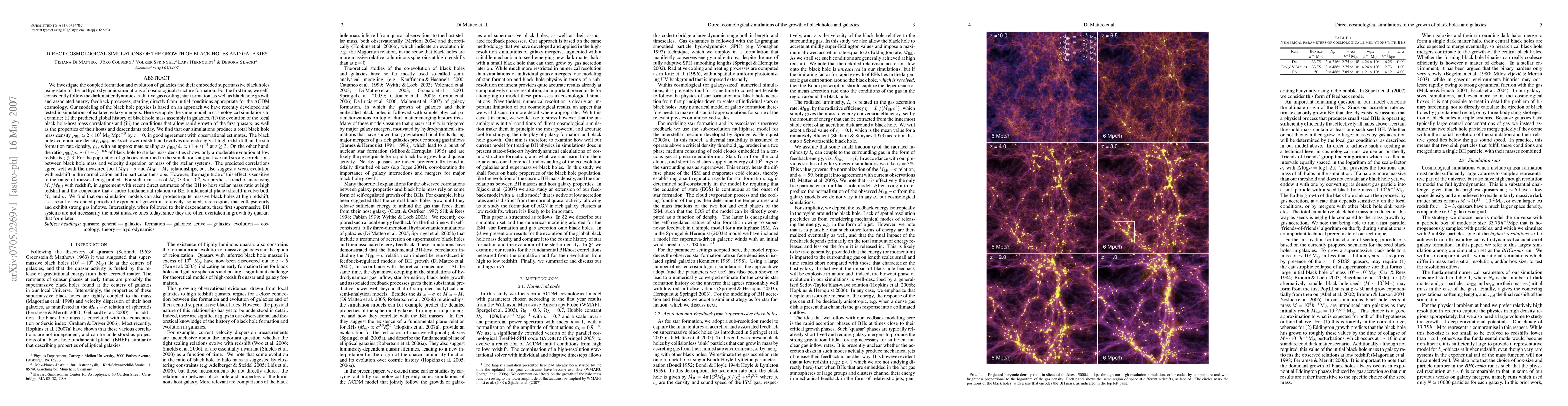 We investigate the coupled formation and evolution of galaxies and their embedded supermassive black holes using state-of-the-art hydrodynamic simulations of cosmological structure formation. For the first time, we self-consistently follow the dark matter dynamics, radiative gas cooling, star formation, as well as black hole growth and associated feedback processes, starting directly from initial conditions appropriate for the LambdaCDM cosmology. Our modeling of the black hole physics is based on an approach we have developed in simulations of isolated galaxy mergers. Here we examine: (i) the predicted global history of black hole mass assembly (ii) the evolution of the local black hole-host mass correlations and (iii) the conditions that allow rapid growth of the first quasars, and the properties of their hosts and descendants today. We find a total black hole mass density in good agreement with observational estimates. The black hole accretion rate density peaks at lower redshift and evolves more strongly at high redshift than the star formation rate density, but the ratio of black hole to stellar mass densities shows only a moderate evolution at low redshifts. We find strong correlations between black hole masses and properties of the stellar systems, agreeing well with the measured local M_BH-sigma and M_BH -M_* relationships, but also suggesting (dependent on the mass range) a weak evolution with redshift in the normalization and the slope. Our simulations also produce massive black holes at high redshift, due to extended periods of exponential growth in regions that collapse early and exhibit strong gas inflows. These first supermassive BH systems however are not necessarily the most massive ones today, since they are often overtaken in growth by quasars that form later. (abridged)