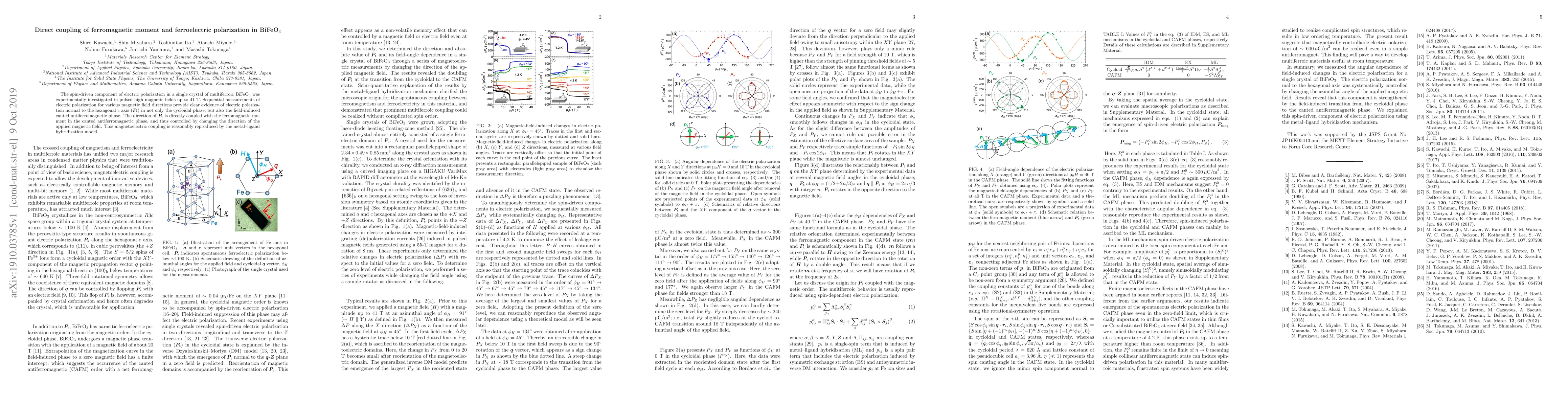 This paper investigates the direct coupling of ferromagnetic moment and ferroelectric polarization in BiFeO$_3$ using pulsed high magnetic fields, revealing a magnetoelectric effect that controls the electric polarization direction by altering the applied magnetic field direction. The findings are well explained by the metal-ligand hybridization model.
