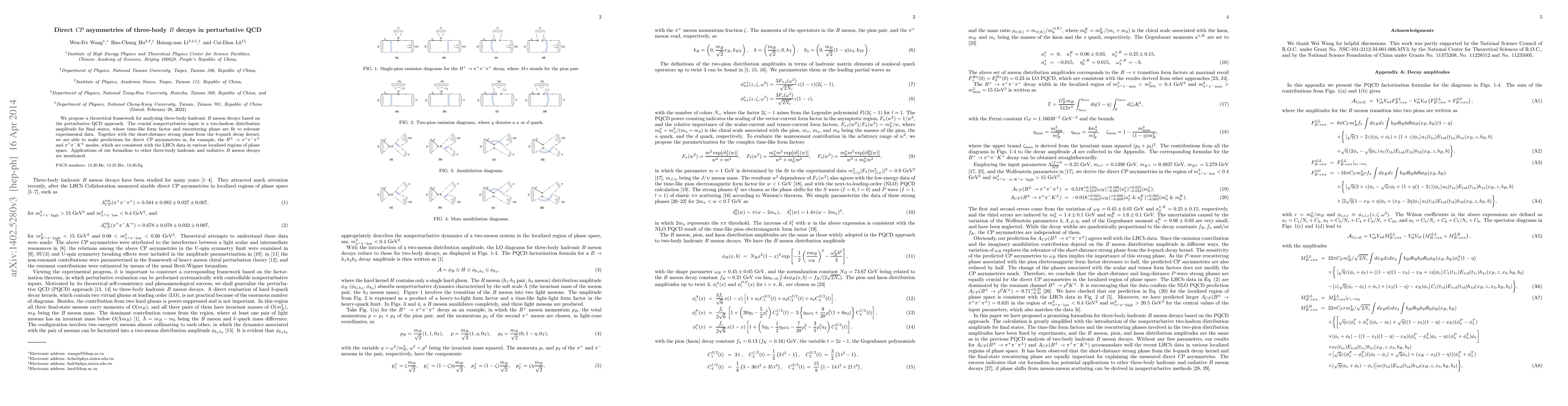 This paper develops a perturbative QCD framework for analyzing three-body $B$ meson decays, incorporating nonperturbative inputs like two-hadron distribution amplitudes. It predicts direct CP asymmetries in specific decay modes, showing consistency with LHCb data.