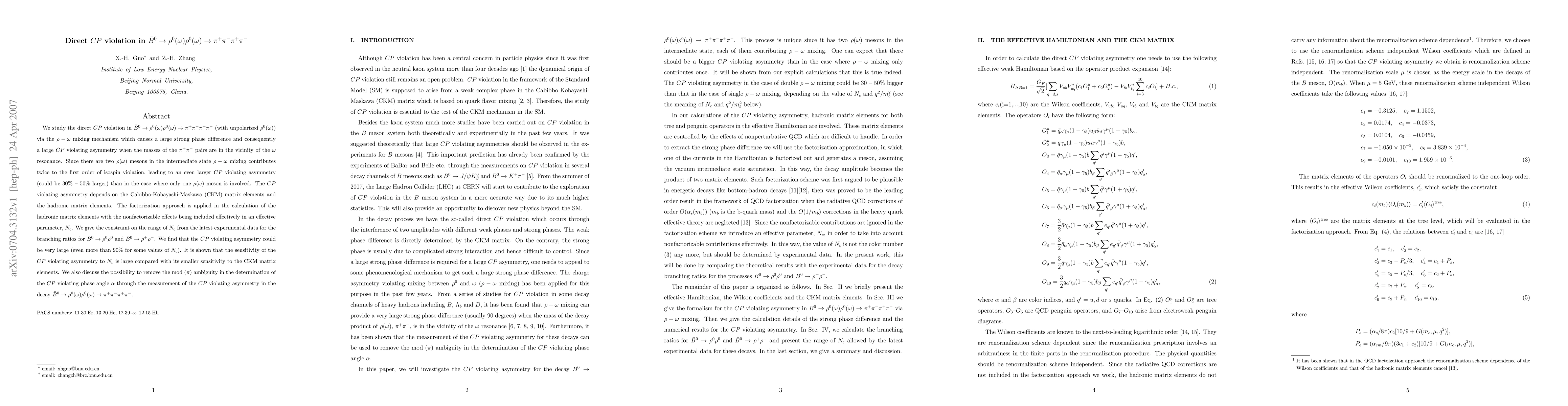 This paper investigates direct CP violation in the decay $\bar{B}^0 \to \rho^0(\omega)\rho^0(\omega) \to \pi^+\pi^-\pi^+\pi^-$, attributing the large CP violating asymmetry to $\rho-\omega$ mixing. The study finds that the asymmetry could be significantly larger due to twice the contribution from isospin violation, potentially exceeding 90% under certain conditions.