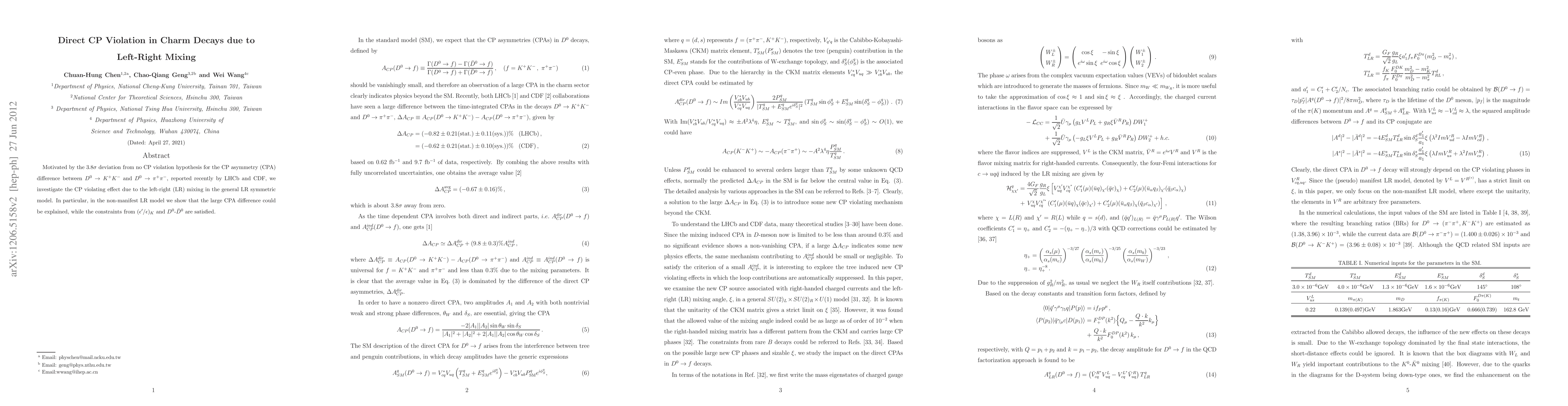 Motivated by the $3.8\sigma$ deviation from no CP violation hypothesis for the CP asymmetry (CPA) difference between $D^0\to K^+ K^-$ and $D^0\to \pi^+ \pi^-$, reported recently by LHCb and CDF, we investigate the CP violating effect due to the left-right (LR) mixing in the general LR symmetric model. In particular, in the non-manifest LR model we show that the large CPA difference could be explained, while the constraints from $(\epsilon'/\epsilon)_K$ and $D^0$-$\bar D^0$ are satisfied.
