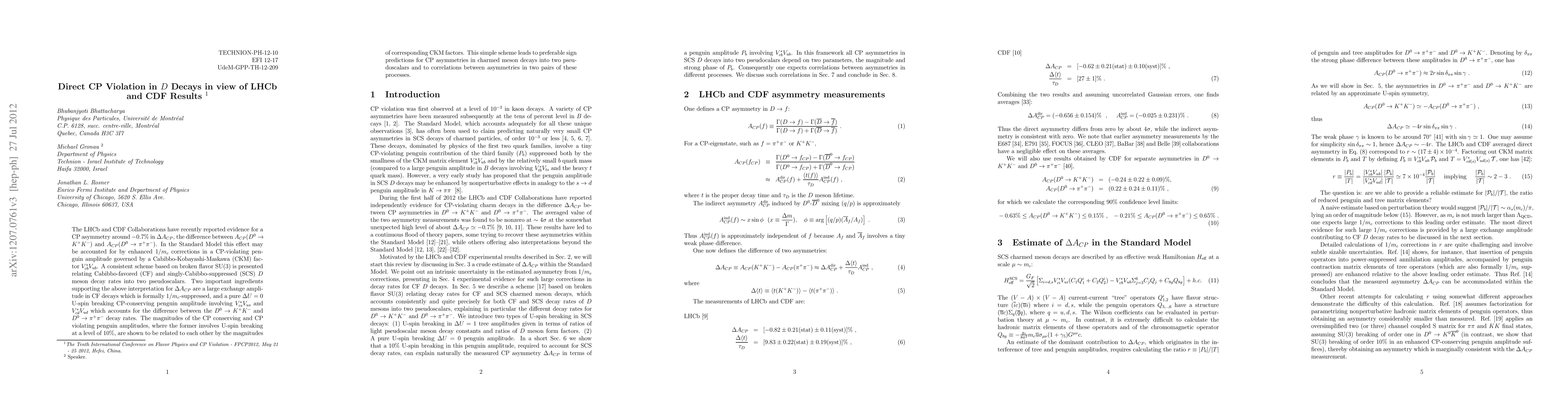 The LHCb and CDF Collaborations have recently reported evidence for a CP asymmetry around -0.7% in $\Delta A_{CP}$, the difference between $A_{CP}(D^0 \to K^+ K^-)$ and $A_{CP}(D^0 \to \pi^+\pi^-)$. In the Standard Model this effect may be accounted for by enhanced $1/m_c$ corrections in a CP-violating penguin amplitude governed by a Cabibbo-Kobayashi-Maskawa (CKM) factor $V^*_{cb}V_{ub}$. A consistent scheme based on broken flavor SU(3) is presented relating Cabibbo-favored (CF) and singly-Cabibbo-suppressed (SCS) $D$ meson decay rates into two pseudoscalars. Two important ingredients supporting the above interpretation for $\Delta A_{CP}$ are a large exchange amplitude in CF decays which is formally $1/m_c$-suppressed, and a pure $\Delta U=0$ U-spin breaking CP-conserving penguin amplitude involving $V^*_{cs}V_{us}$ and $V^*_{cd}V_{ud}$ which accounts for the difference between the $D^0\to K^+K^-$ and $D^0\to \pi^+\pi^-$ decay rates. The magnitudes of the CP conserving and CP violating penguin amplitudes, where the former involves U-spin breaking at a level of 10%, are shown to be related to each other by the magnitudes of corresponding CKM factors. This simple scheme leads to preferable sign predictions for CP asymmetries in charmed meson decays into two pseudoscalars and to correlations between asymmetries in two pairs of these processes.