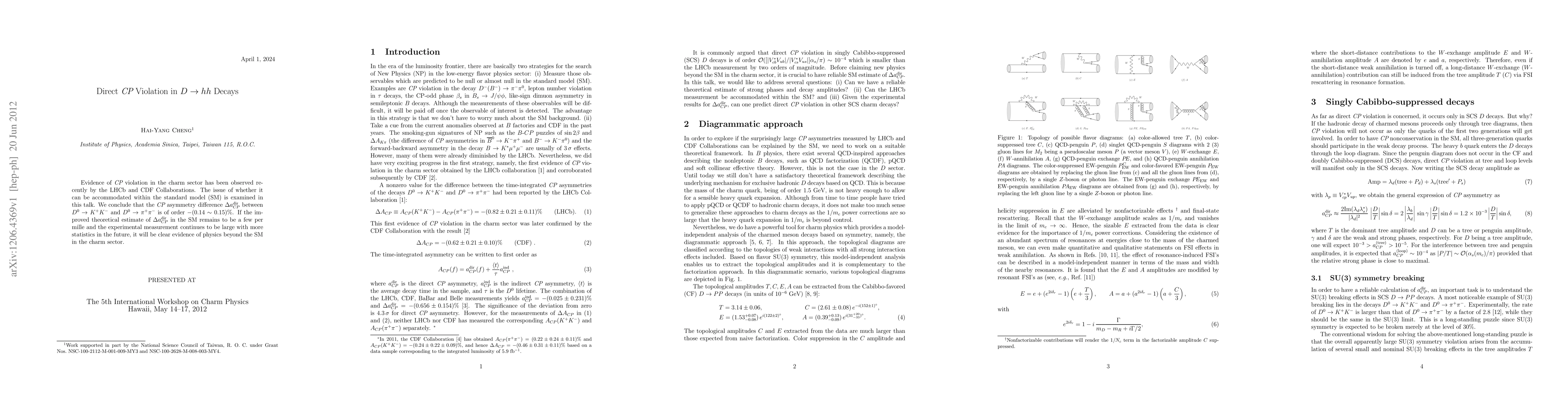 Evidence of CP violation in the charm sector has been observed recently by the LHCb and CDF Collaborations. The issue of whether it can be accommodated within the standard model (SM) is examined in this talk. We conclude that the CP asymmetry difference $\Delta a_{CP}^{\rm dir}$ between $D^0 \to K^+ K^-$ and $D^0 \to \pi^+ \pi^-$ is of order $-(0.14\sim 0.15)%$. If the improved theoretical estimate of $\Delta a_{CP}^{\rm dir}$ in the SM remains to be a few per mille and the experimental measurement continues to be large with more statistics in the future, it will be clear evidence of physics beyond the SM in the charm sector.