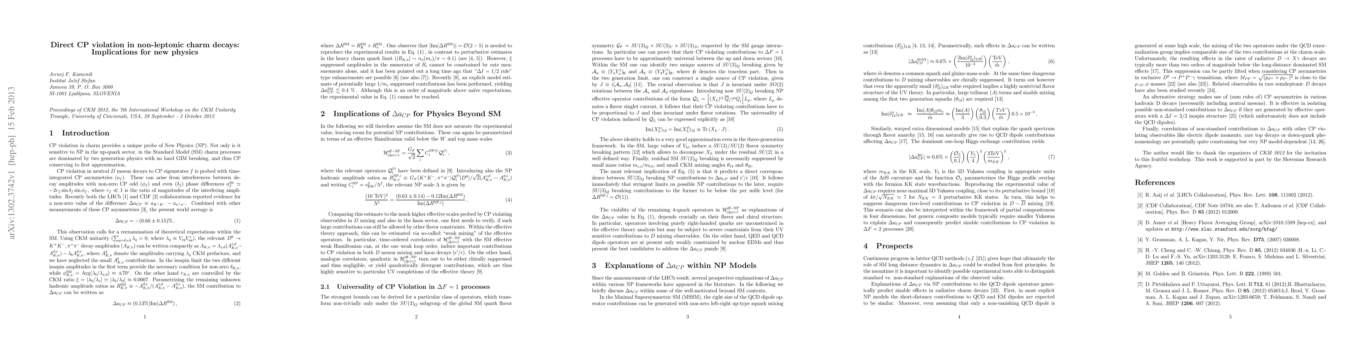 I review the implications of recent measurements of CP violation in D meson decays in the context of standard model extensions. Using effective theory methods, one can derive significant constraints on the possible non-standard contributions from measurements of neutral D meson mixing and direct CP violation in kaon decays. Due to an approximate universality of CP violation in new physics scenarios which only break the SU(3)_Q flavor symmetry of the standard model kinetic Lagrangian, such contributions are particularly constrained by epsilon'/epsilon. Explanations of the observed effect within several explicit well-motivated new physics frameworks are briefly discussed. Finally, possible future experimental tests able to distinguish standard vs. non-standard explanations of the observed CP violation in the charm sector are mentioned.