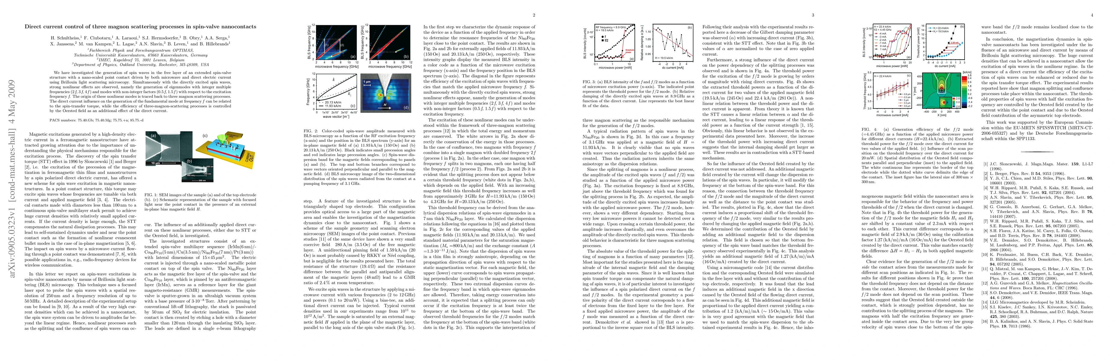 We have investigated the generation of spin waves in the free layer of an extended spin-valve structure with a nano-scaled point contact driven by both microwave and direct electric current using Brillouin light scattering microscopy. Simultaneously with the directly excited spin waves, strong nonlinear effects are observed, namely the generation of eigenmodes with integer multiple frequencies (2 \emph{f}, 3 \emph{f}, 4 \emph{f}) and modes with non-integer factors (0.5 \emph{f}, 1.5 \emph{f}) with respect to the excitation frequency \emph{f}. The origin of these nonlinear modes is traced back to three magnon scattering processes. The direct current influence on the generation of the fundamental mode at frequency \emph{f} can be related to the spin-transfer torque, while the efficiency of three-magnon-scattering processes is controlled by the Oersted field as an additional effect of the direct current.