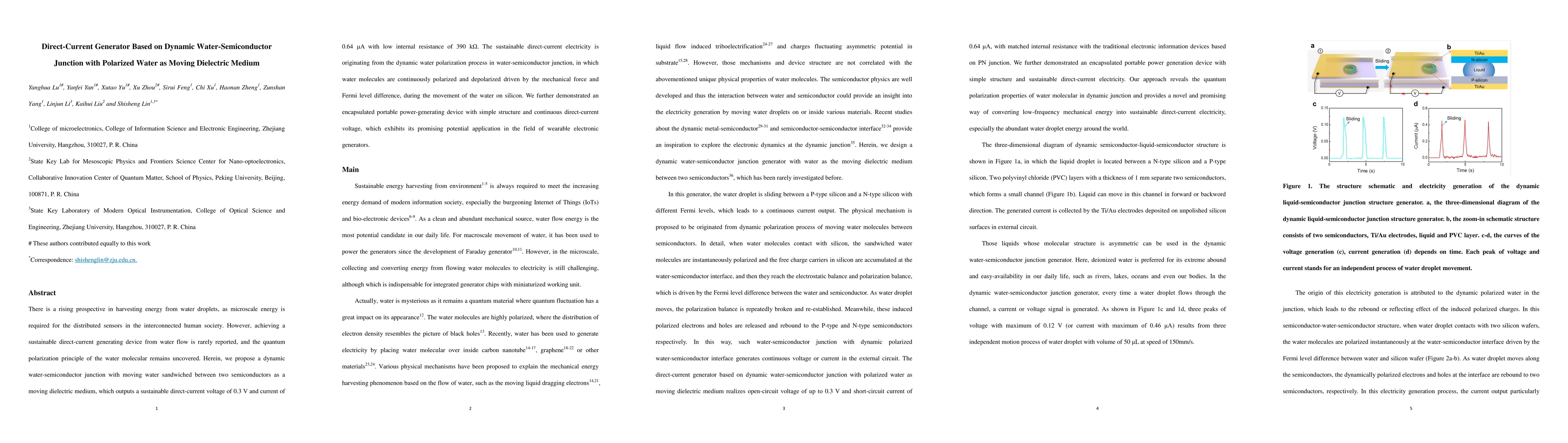 This paper proposes a novel direct-current generator utilizing a dynamic water-semiconductor junction with polarized water as a moving dielectric medium, generating a sustainable 0.3 V direct-current voltage and current of 0.64 uA, showcasing potential for wearable electronic applications.