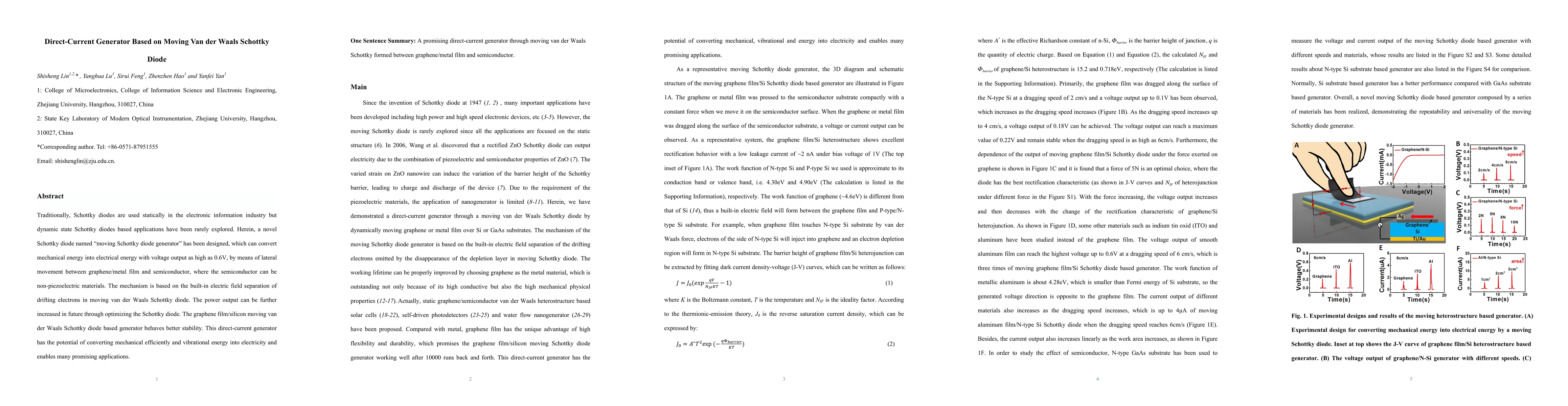 Traditionally, Schottky diodes are used statically in the electronic information industry but dynamic state Schottky diodes based applications have been rarely explored. Herein, a novel Schottky diode named moving Schottky diode generator has been designed, which can convert mechanical energy into electrical energy with voltage output as high as 0.6V, by means of lateral movement between graphene/metal film and semiconductor, where the semiconductor can be non-piezoelectric materials. The mechanism is based on the built-in electric field separation of drifting electrons in moving van der Waals Schottky diode. The power output can be further increased in future through optimizing the Schottky diode. The graphene film/silicon moving van der Waals Schottky diode based generator behaves better stability. This direct-current generator has the potential of converting mechanical efficiently and vibrational energy into electricity and enables many promising applications.