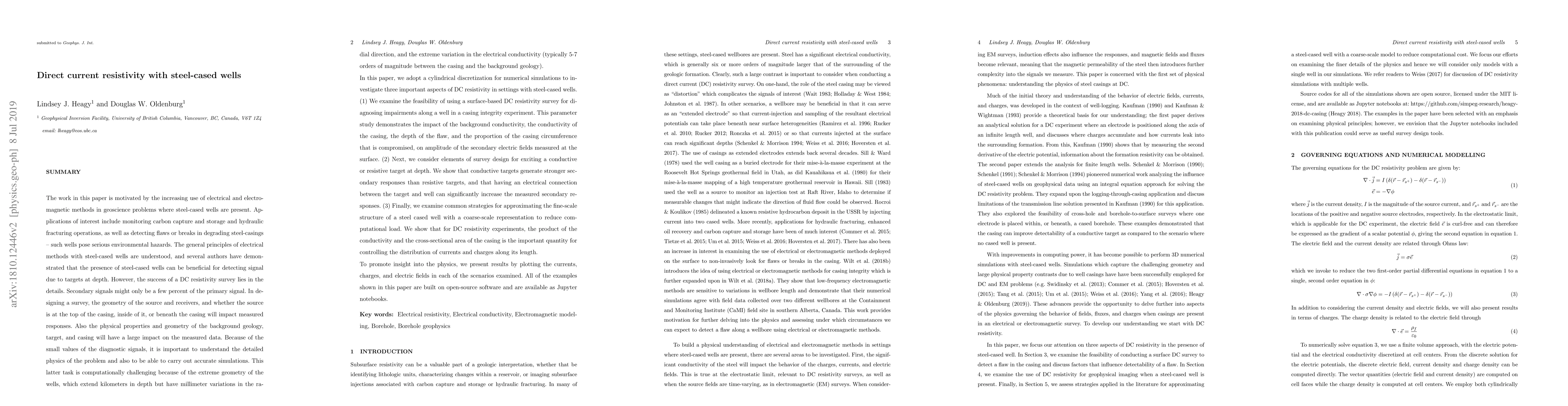 Researchers investigated how steel-cased wells affect direct current resistivity surveys, finding that accurate simulations and understanding of the problem's physics are crucial due to small diagnostic signals and extreme geometry variations.