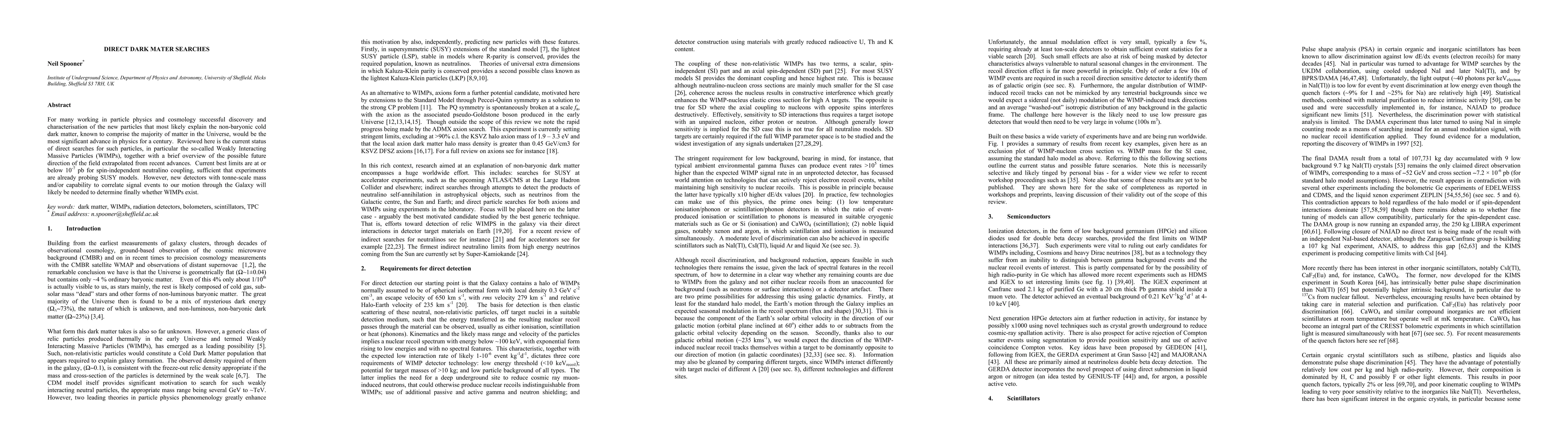 For many working in particle physics and cosmology successful discovery and characterisation of the new particles that most likely explain the non-baryonic cold dark matter, known to comprise the majority of matter in the Universe, would be the most significant advance in physics for a century. Reviewed here is the current status of direct searches for such particles, in particular the so-called Weakly Interacting Massive Particles (WIMPs), together with a brief overview of the possible future direction of the field extrapolated from recent advances. Current best limits are at or below 10-7 pb for spin-independent neutralino coupling, sufficient that experiments are already probing SUSY models. However, new detectors with tonne-scale mass and/or capability to correlate signal events to our motion through the Galaxy will likely be needed to determine finally whether WIMPs exist.