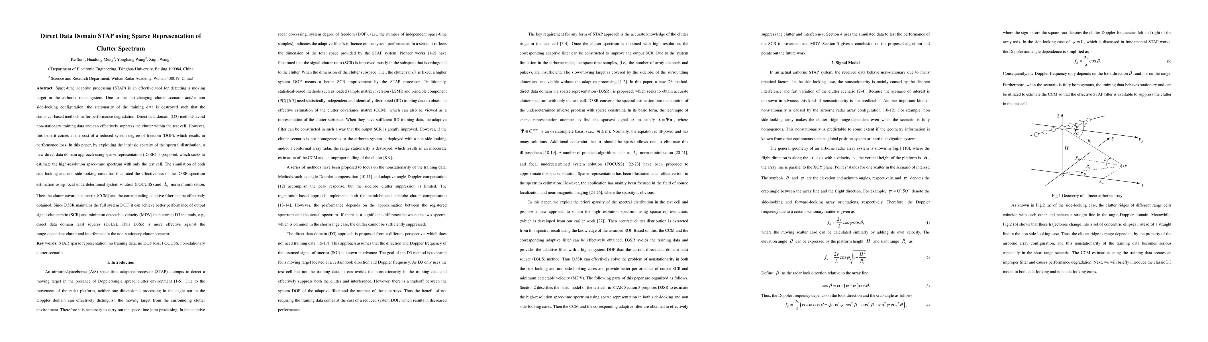 This paper proposes a new direct data domain STAP method using sparse representation (D3SR) to effectively suppress clutter in airborne radar systems. By leveraging the intrinsic sparsity of the clutter spectrum, D3SR maintains full system degree of freedom, achieving better performance in signal-clutter-ratio and minimum detectable velocity compared to existing D3 methods.