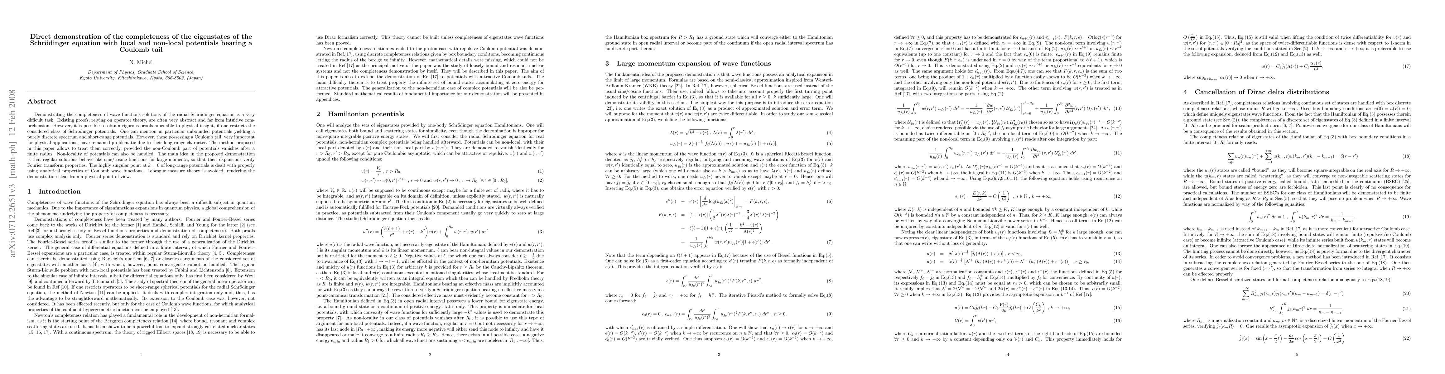This paper presents a method to rigorously prove the completeness of wave function solutions for the Schrödinger equation, specifically addressing potentials with a Coulomb tail and non-locality. The approach uses physical insights, avoiding complex measure theory, and focuses on how regular solutions behave like sine/cosine functions for large momenta.